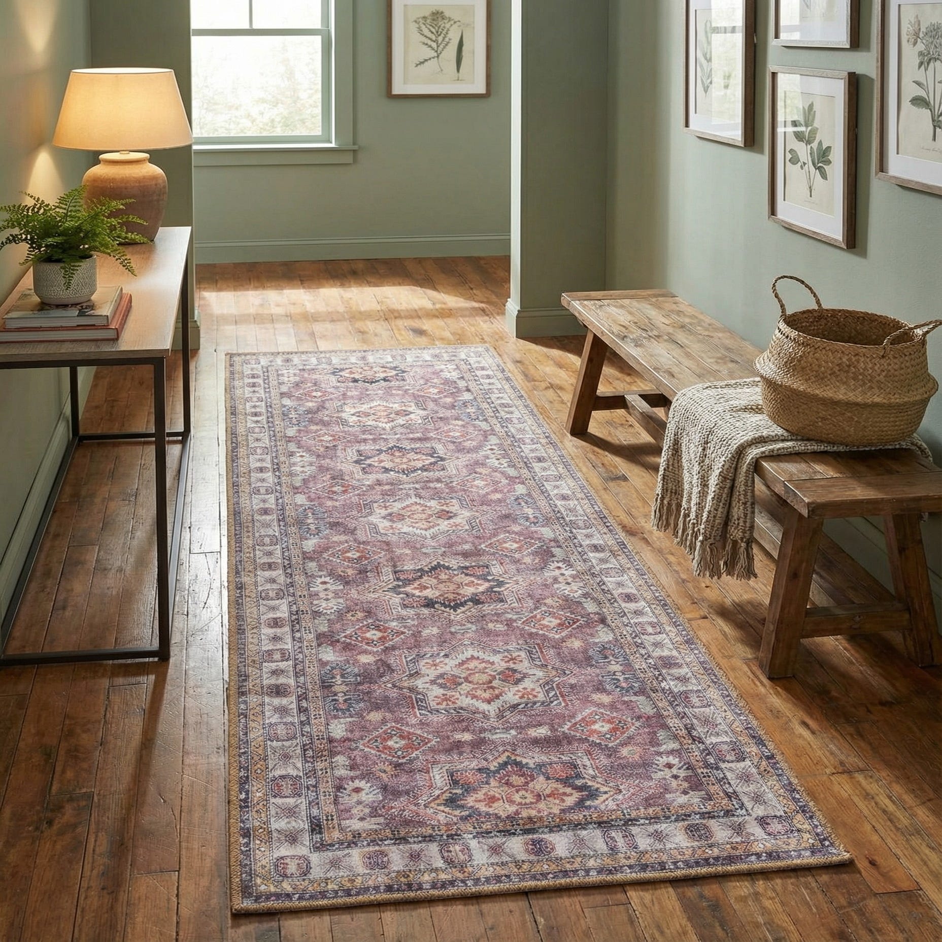 A 6 ft runner rug featuring an antique rose pink, cream, and navy Oriental pattern with a textured flatweave pile, ideal for a hallway.