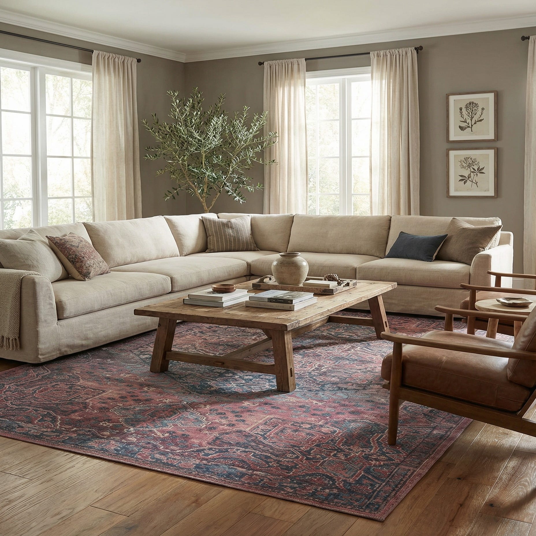 Works well as an anchor for a living room seating group or layered beneath a low-profile sofa and coffee table, where the warm rust and navy accents bring depth to neutral upholstery. Pair it with natural wood tones, brass or aged metal accents and ivory textiles for a transitional look, or combine with textured pillows and woven baskets for a relaxed bohemian or global-inspired scheme. It also adds warmth and pattern at the foot of a bed or under a dining table to introduce color without overwhelming the room.