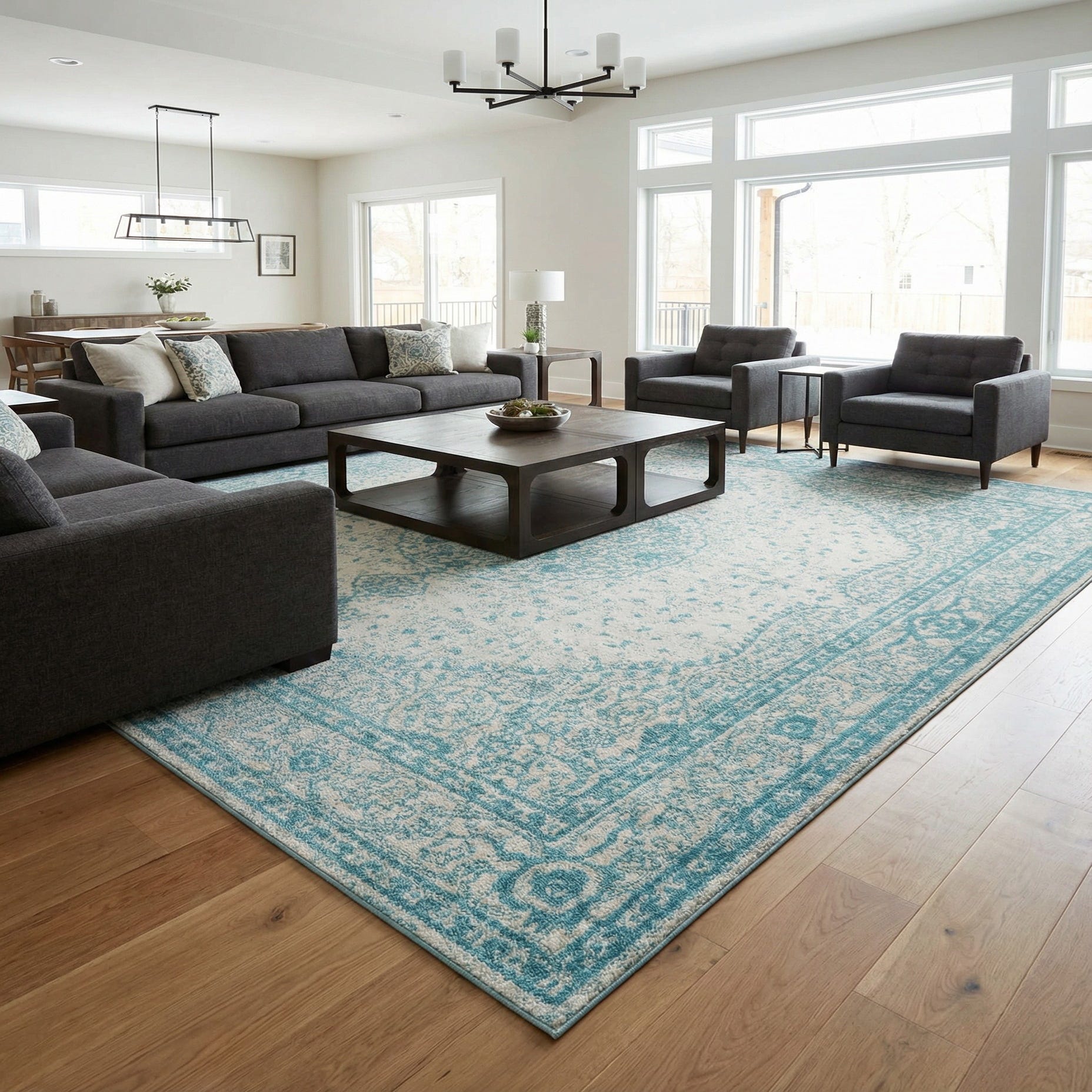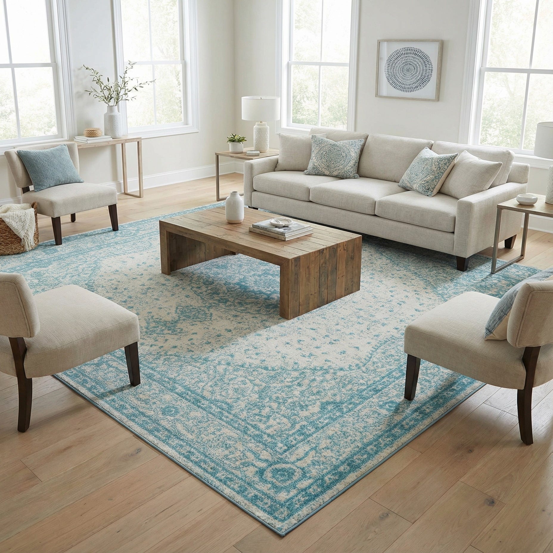 This rug would integrate gracefully into interiors that lean towards coastal, traditional, or shabby chic styles, thanks to its serene color scheme and classic design. It can serve as a calming anchor in a living room, bedroom, or dining area, balancing well with neutral or complementary color palettes.
