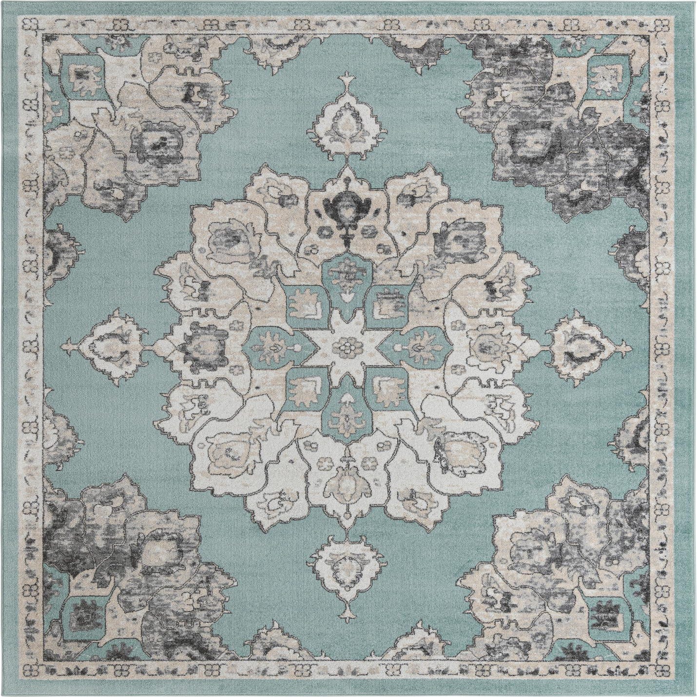 Pair this rug with light wood or painted furniture and linen upholstery for a relaxed coastal or transitional feel, or combine it with darker finishes and metal accents for a more modern-traditional mix. It will anchor a living room seating group, sit nicely beneath a dining table, or add a calming color layer under bed and bedside furniture in a bedroom. The aqua field brings refreshing color while the neutral beige, ivory, gray, and black tones keep the overall look versatile and easy to coordinate.