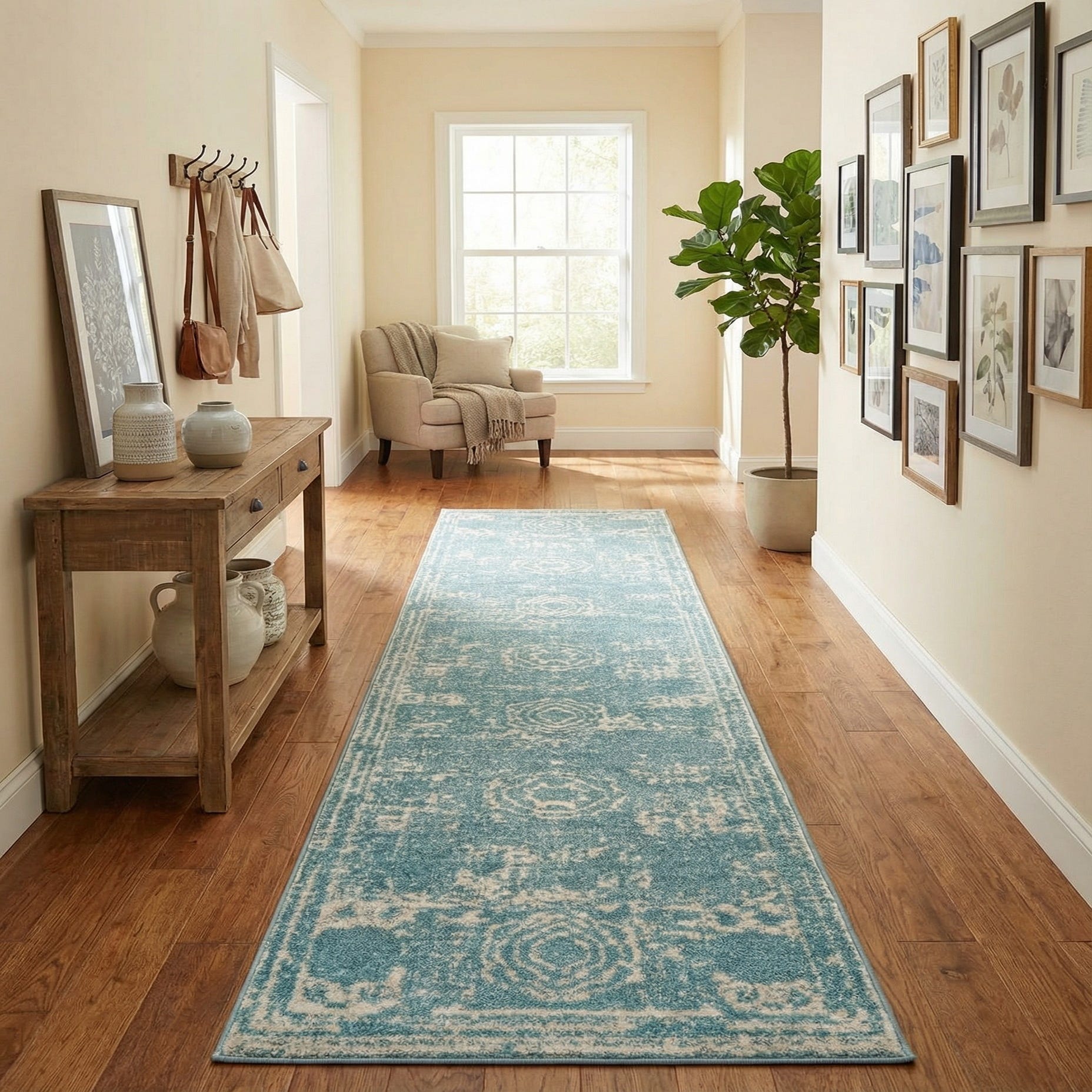 A soft aqua ground sets the tone on this runner, where a series of ivory medallions and a narrow border read like a gently worn, vintage rug. The pattern is intentionally distressed, giving the traditional motifs a relaxed, lived-in look that feels both classic and casual. The contrast between the aqua background and ivory accents keeps the design light and airy without being fussy.