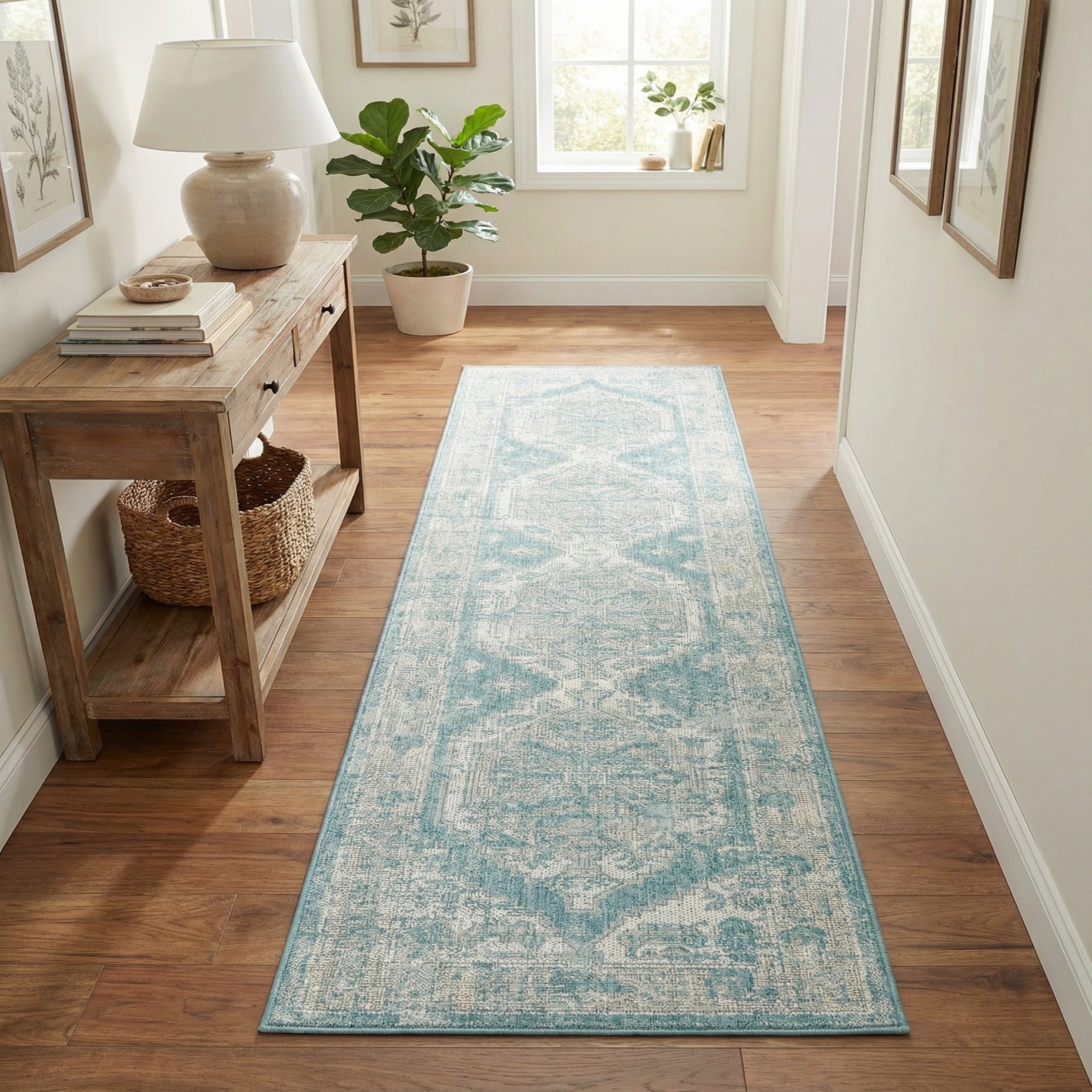 With its versatile color palette, this rug harmoniously aligns with a variety of decors, from coastal themes that echo the rug's aqua tones to minimalistic spaces where its classic design can serve as a focal point. The runner's narrow width makes it a fitting addition to corridors, entryways, or alongside kitchen islands, further enhancing the elegance and functionality of these spaces.