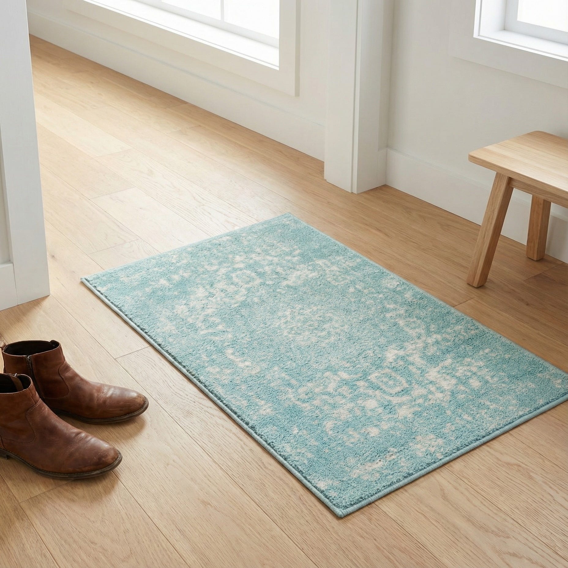 This rug works well as a calming accent in coastal or cottage-style rooms, a bright pop in a neutral living area, or a soft layer at the foot of a bed. It also fits nicely in a small seating nook or entry where you want color without overwhelming the space—pair with light woods, white or sandy linens, and simple metallic accents for a fresh, relaxed feel.