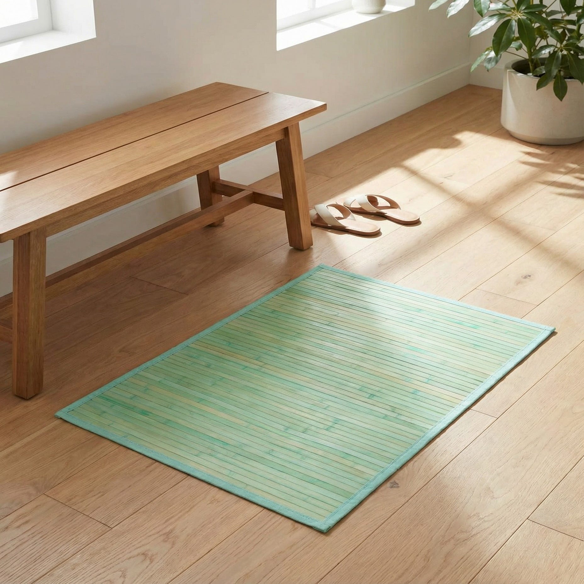 This rug suits relaxed, coastal-inspired interiors as well as modern, minimalist spaces that benefit from a splash of color without visual clutter. Place it in a bright entry, a sunroom, or a kitchen to add a fresh, airy layer; it also pairs well with rattan or light wood furniture, whitewashed surfaces, and muted linens. For a bit more contrast, offset the aqua with navy accents or warm natural textures like jute and woven baskets to balance the cool tones.