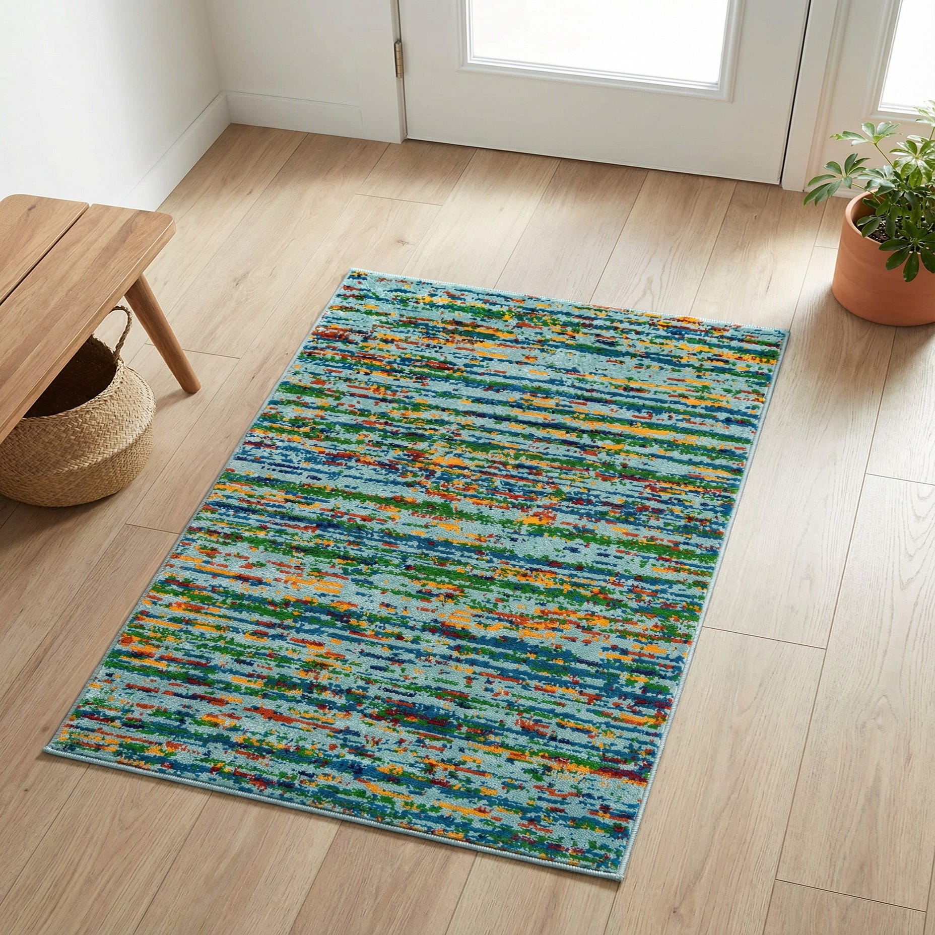 A refreshing aqua ground anchors a modern, abstract stripe pattern made up of painterly dashes and flecks in blue, red, yellow, and green. The horizontal striations create visual movement across the surface without a strict repeat, giving the piece a lively, contemporary character. Machine made from 100% polypropylene, the rug has a low, dense pile with a soft hand that provides a comfortable underfoot feel while maintaining a tidy, structured appearance.