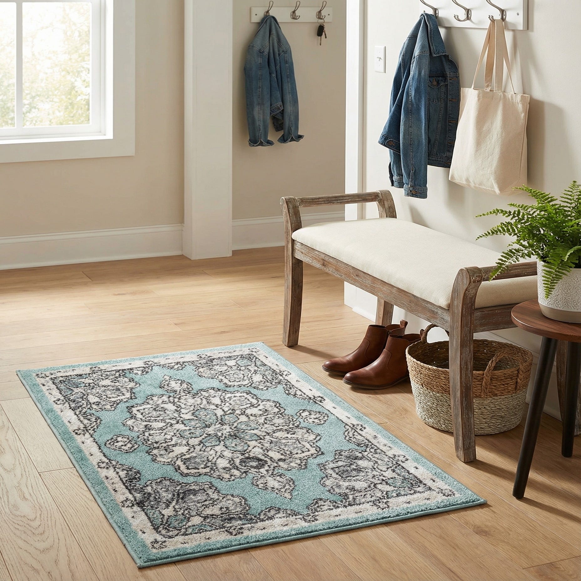 This piece works well as an accent in smaller areas — place it in an entryway, in front of a console or sink, or layered at the foot of a bed. The aqua ground pairs nicely with coastal and cottage schemes, light wood floors, and white or neutral furnishings, while the neutral grays and beiges make it easy to incorporate into transitional or shabby-chic interiors that benefit from a touch of color and pattern.
