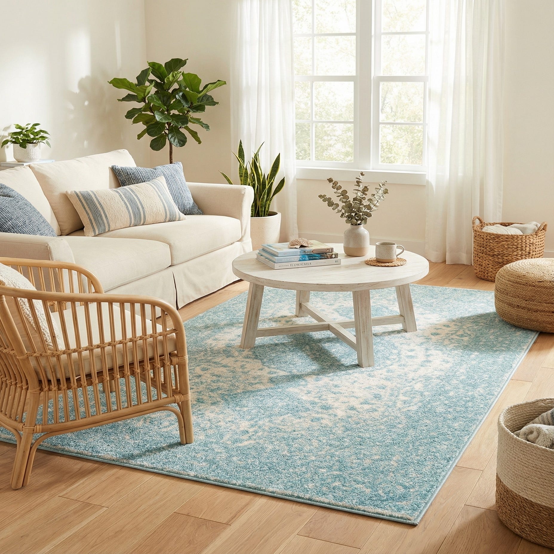 Primary color is Aqua. Colors in this rug include: Aqua, Ivory.