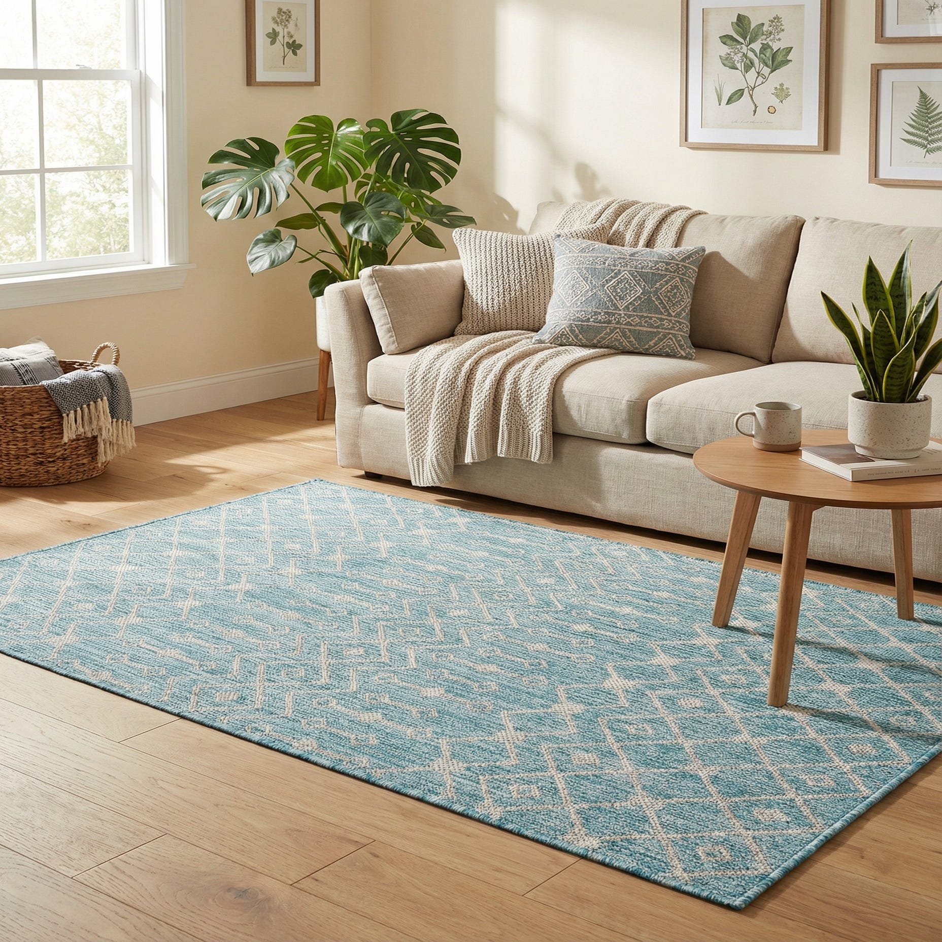 Machine-made in 100% polypropylene, the construction is designed for outdoor living and busy indoor spaces. It pairs naturally with light-wood or painted furniture and airy linens for a coastal or cottage-inspired setting, anchors a modern patio seating area with navy accents and metal planters, or brings a fresh splash of color to a sunroom or covered balcony when used beneath a bistro table.