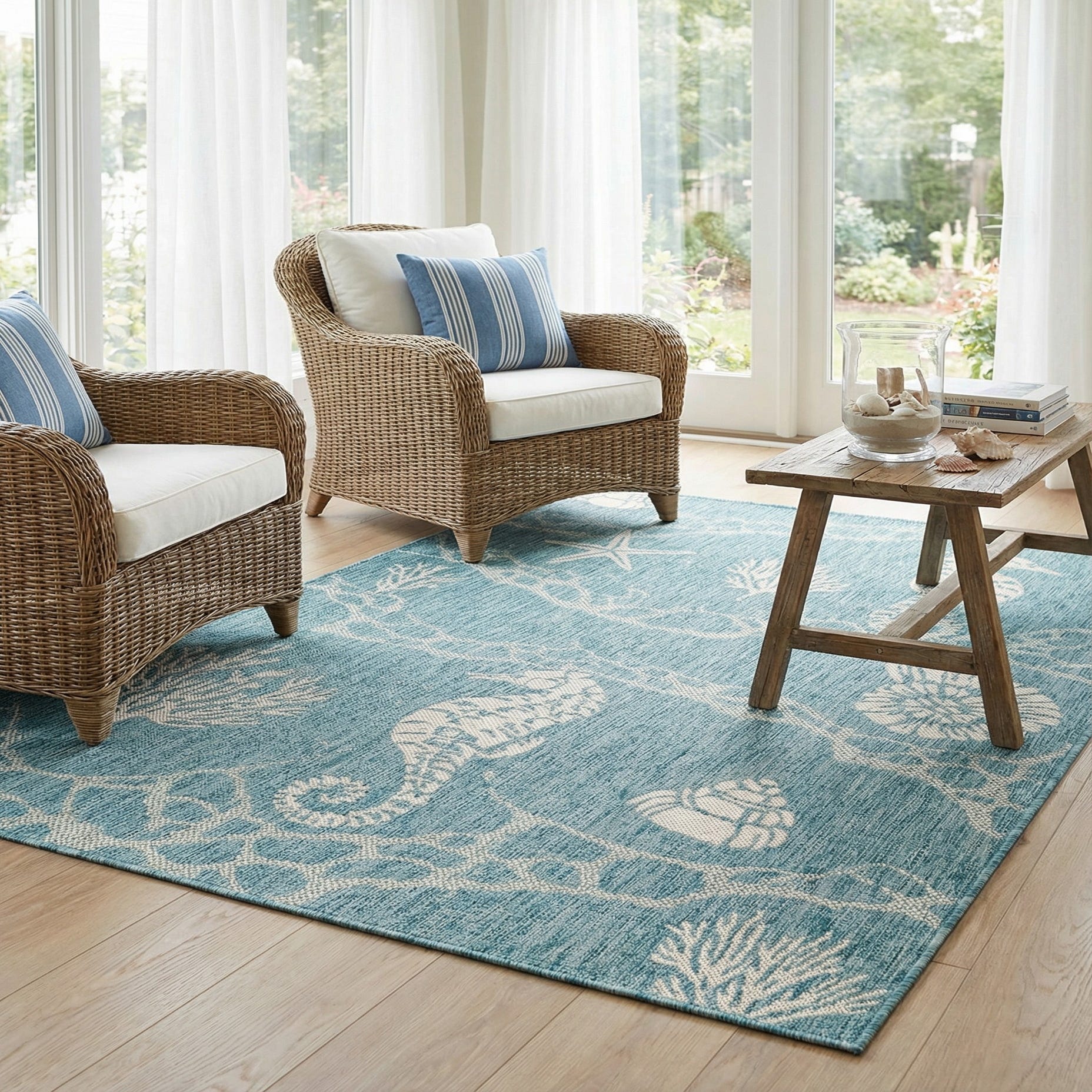 A 4x6 rectangular blue indoor/outdoor rug with a white coastal pattern featuring seahorses, starfish, and coral.