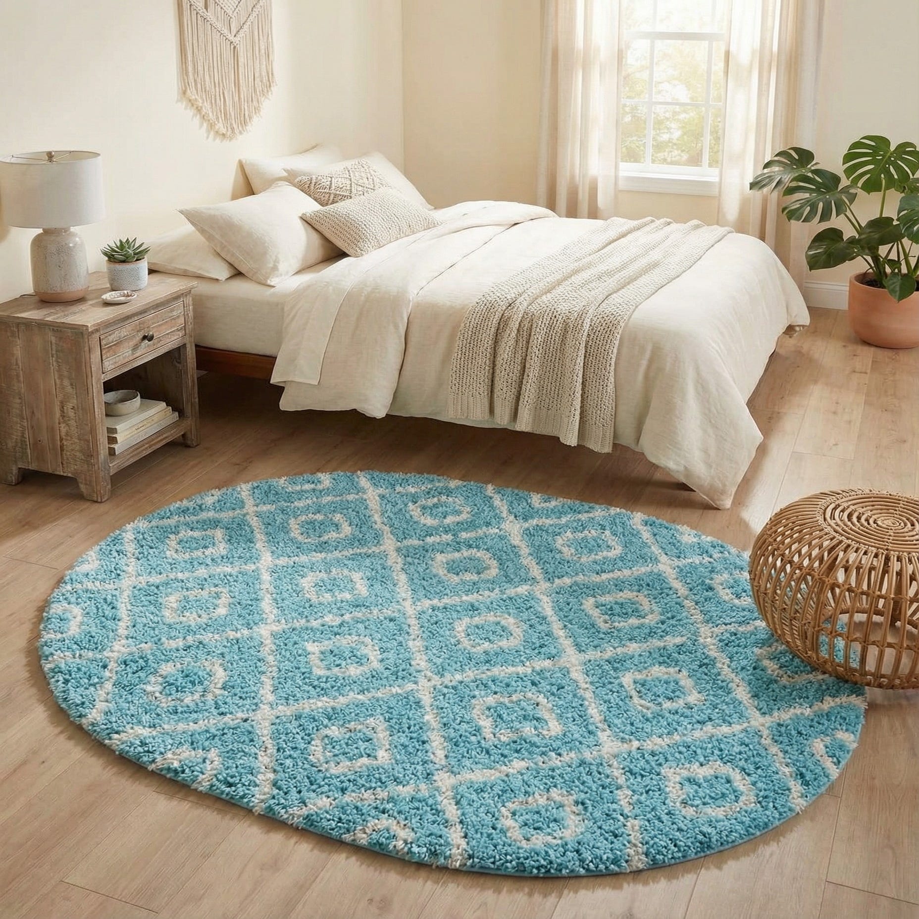 The oval profile softens room lines and fits nicely in small seating areas, in front of a bed, or beneath a round bistro table. The aqua and ivory palette pairs easily with coastal and beach-inspired interiors, light, airy contemporary rooms, or casual modern spaces; it also brings a cheerful touch to a child’s room or sunroom when layered with natural woods, linen upholstery, and woven accents.