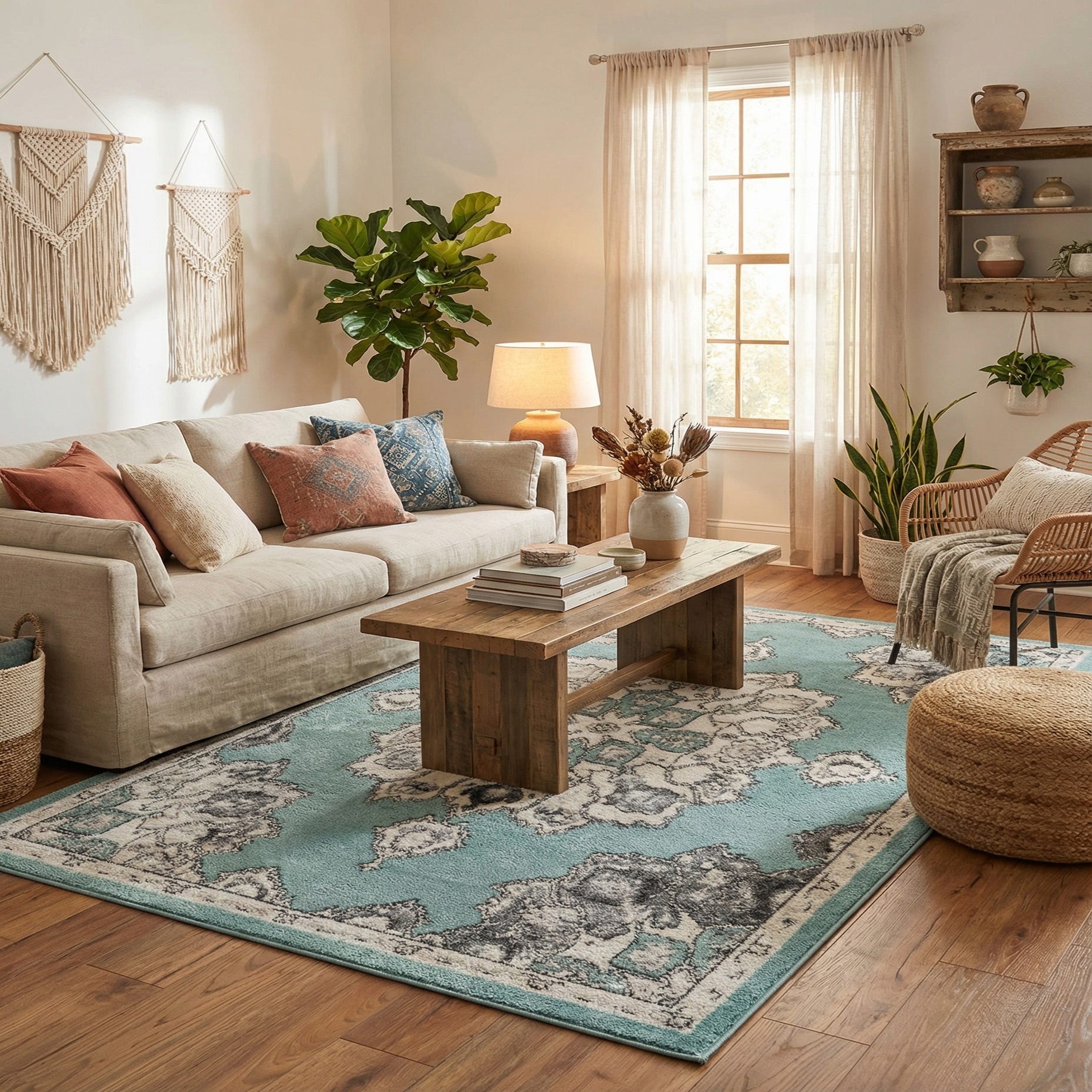 Machine made from 100% polypropylene, the rug has a low, even pile with a smooth, cushioned feel underfoot. The aqua background brings a fresh, coastal tone, and the mix of ivory, beige, gray and black makes it easy to pair with neutral furnishings or bolder accent pieces. Use it to anchor a small seating area or coffee table, place it at the foot of a bed to introduce color and pattern, or position it in an entryway or guest room to add a welcoming, layered look.