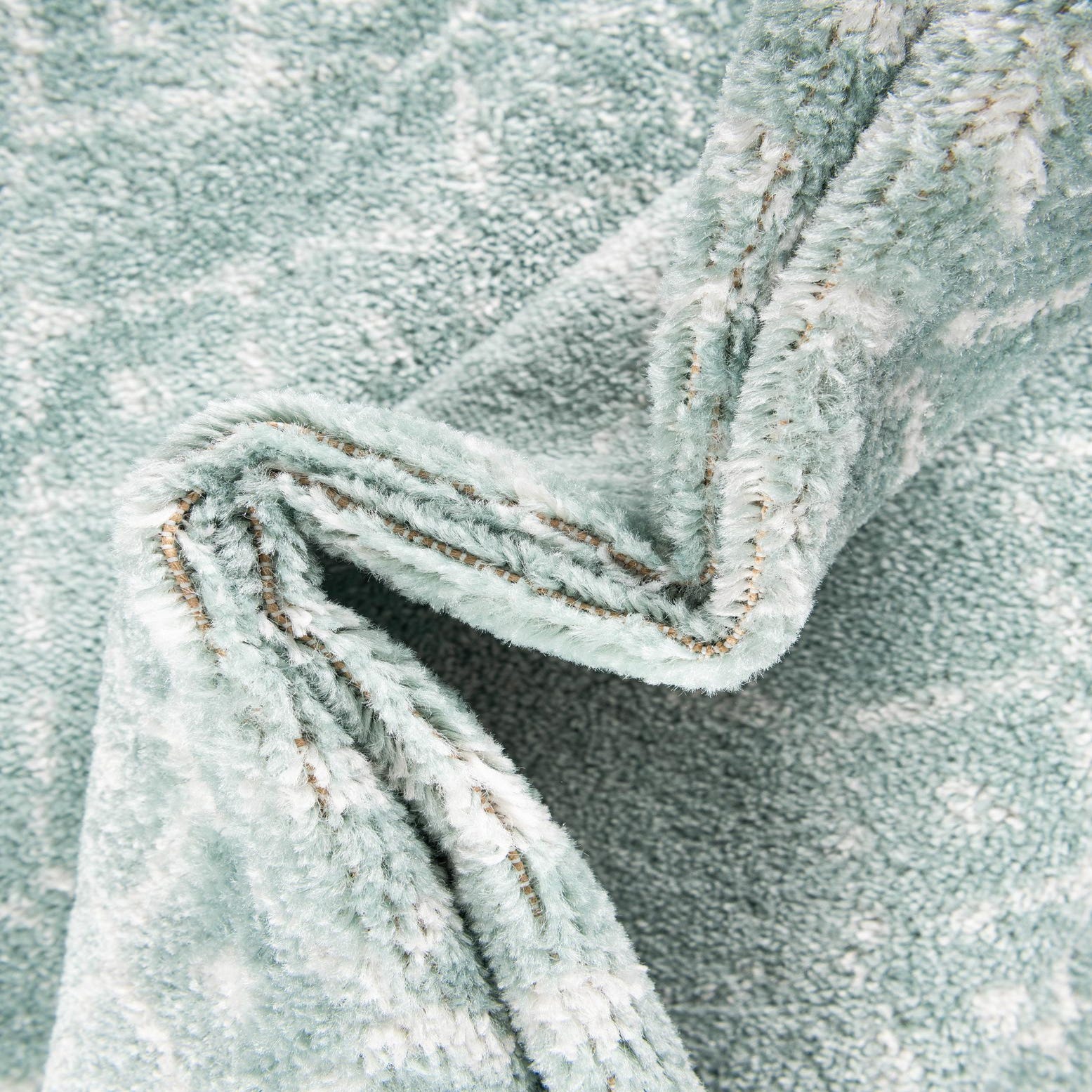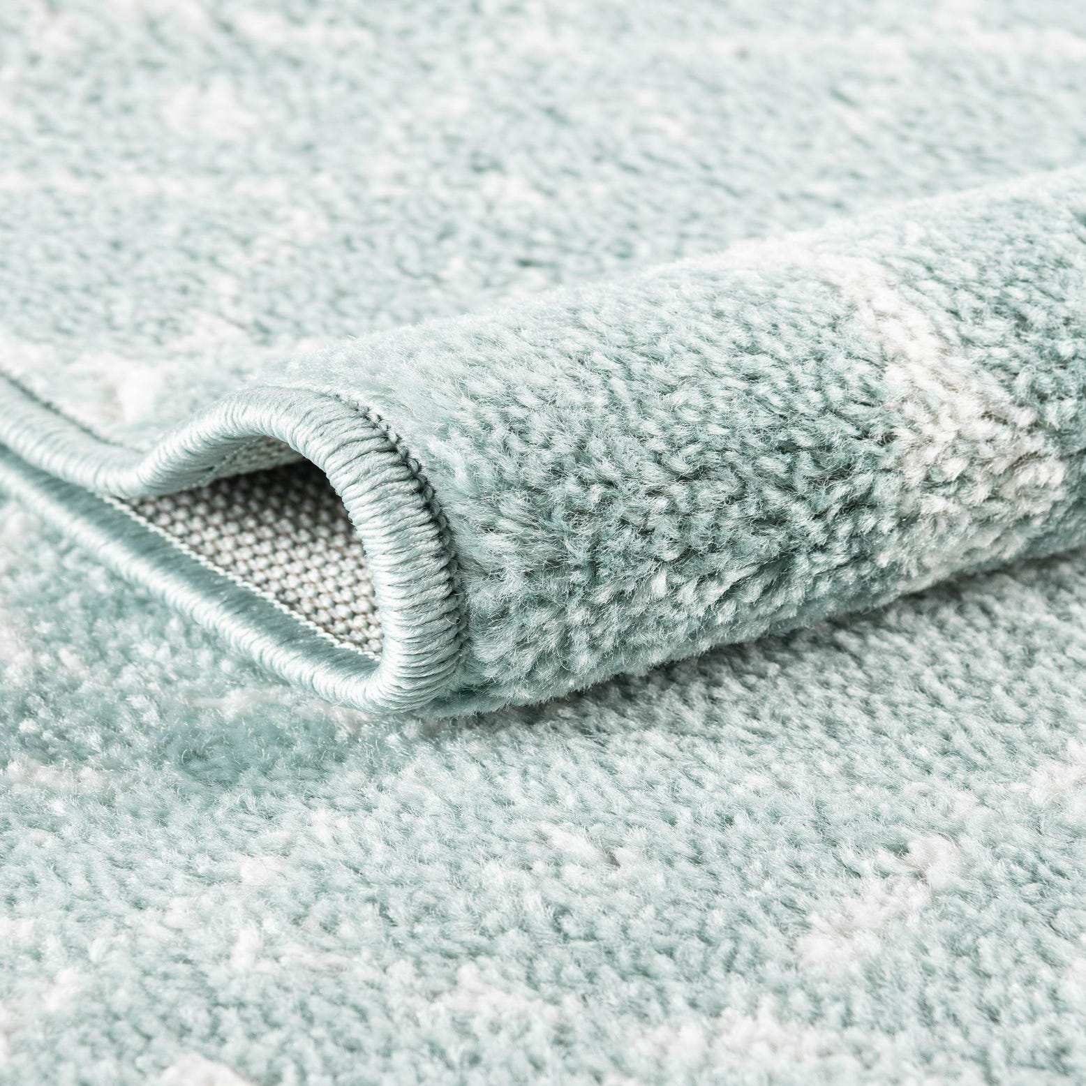 Soft aqua forms the background of this octagonal rug, where an ivory trellis pattern of interlocking diamonds and elongated medallions adds gentle geometric interest. The machine-made construction in 100% polypropylene creates a low-profile pile with a smooth, slightly plush hand—comfortable underfoot without being bulky—and a subtle, even finish that highlights the pattern without overwhelming the color.