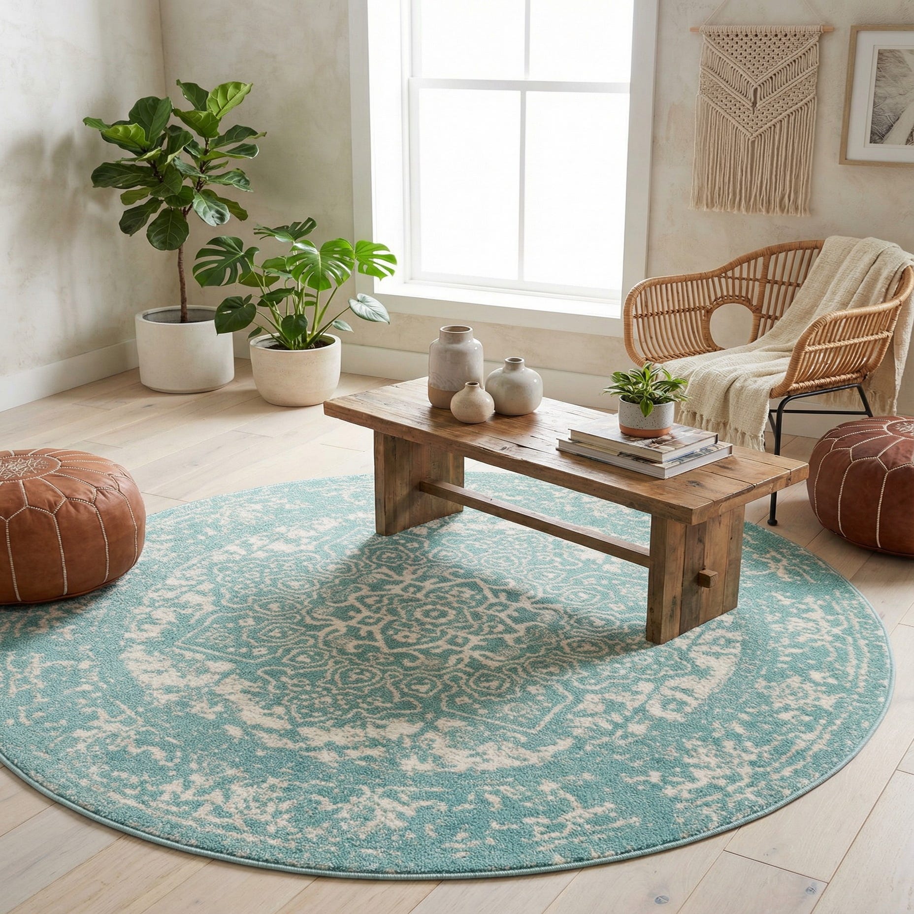 A softly distressed medallion design in ivory rests on a clean aqua field, giving this round rug a vintage-inspired look with modern clarity. The ornate center motif and surrounding border are rendered with subtle fading that adds visual depth without overpowering the pattern. Machine made of 100% polypropylene, the rug has a low, dense pile that feels smooth and slightly velvety underfoot while keeping the ivory details crisp against the aqua background.