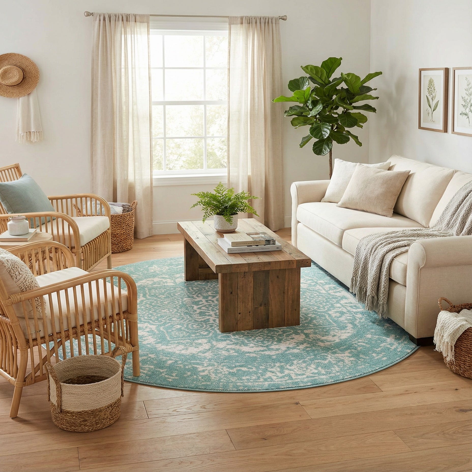 This rug fits well in coastal, cottage, or contemporary interiors—pair it with whitewashed wood, rattan accents, or soft gray upholstery to enhance the airy color story. It works nicely under a small round dining table, as an anchor for a cozy seating nook, or in a bedroom or nursery for a fresh pop of color. The aqua background brings brightness while the ivory pattern maintains a calm, balanced look.