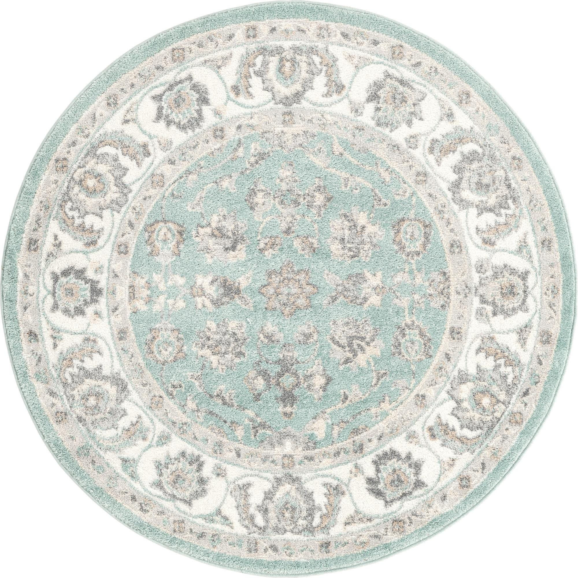 A round rug with a central medallion and ornate floral border, this piece has a classic, slightly vintage-inspired pattern rendered in a fresh colorway. The aqua background gives the design a cool, airy foundation while ivory and beige motifs create soft contrast; touches of gray and black add definition to the floral elements and border scrollwork. Machine-made from 100% polypropylene, the pile is low-profile with a pleasantly soft hand and a subtle sheen that highlights the pattern without overwhelming the room.