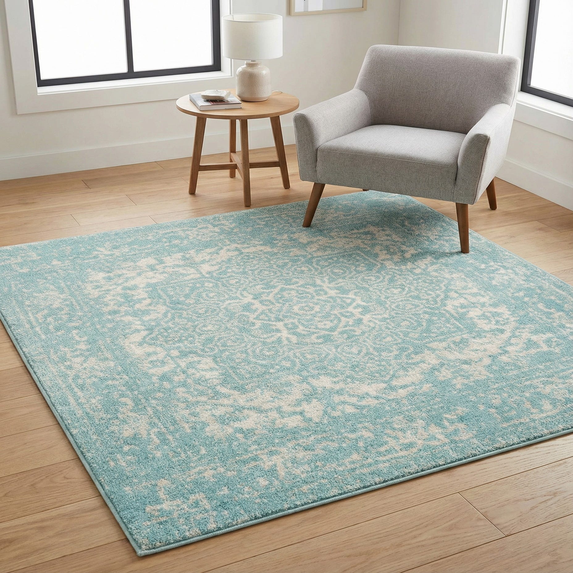 This rug fits well in coastal and cottage-style rooms, lending a cool, airy anchor to a sunroom or living area. It also complements transitional spaces—pair it with white or light-washed wood furniture, linen upholstery, and natural woven accents for a relaxed, layered look. Use it to brighten a bedroom, define a reading nook, or sit beneath a small dining set where an understated splash of aqua and ivory will lift the scheme.