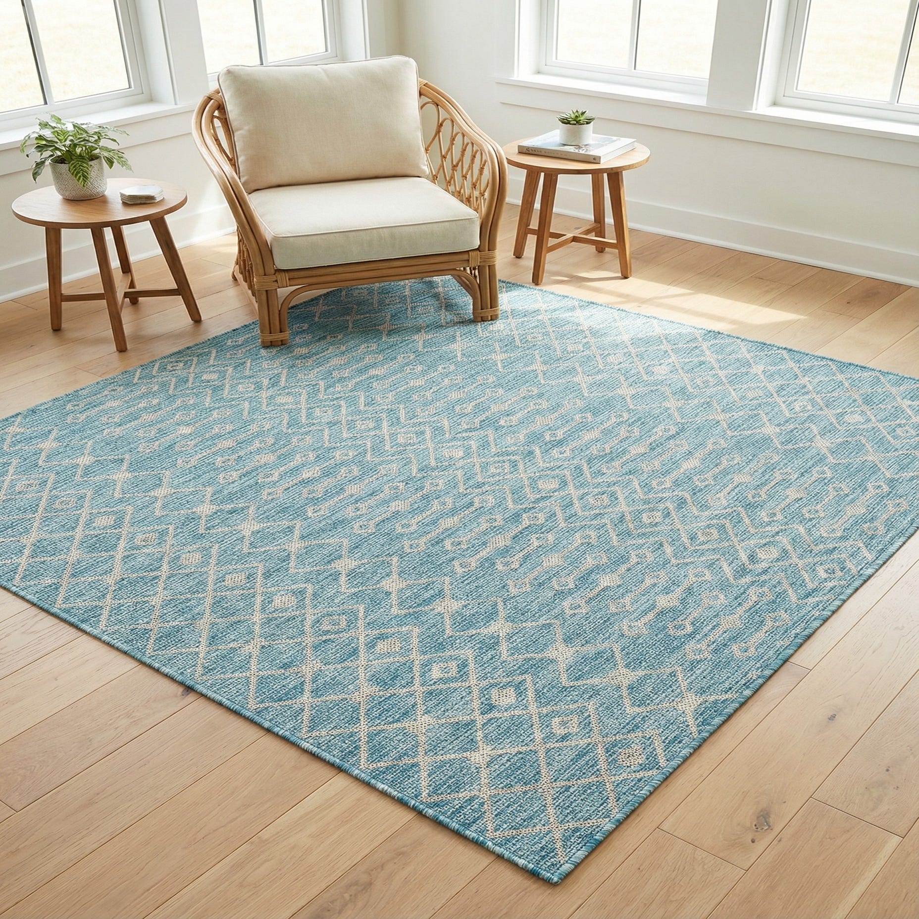 This rug brings a fresh, coastal-ready color palette to covered patios, sunrooms, or poolside seating areas, and it also works well in breezy dining nooks or casual entryways. Pair it with white-washed wicker or teak furniture, crisp linen cushions, and soft gray accents for a relaxed, modern coastal feel; it also complements contemporary and transitional spaces that benefit from a pop of aqua without overwhelming the room.