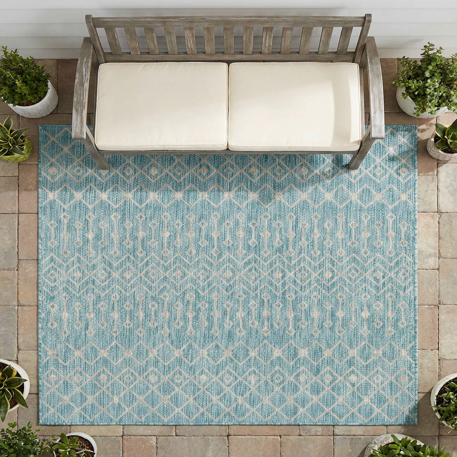 Machine-made from 100% polypropylene, this outdoor-ready rug has an aqua background threaded with a repeating gray lattice and linked-oval motif. The pattern alternates rows of diamond lattices and vertical connector shapes for a geometric, rhythmic look. Its low-profile, tightly woven construction creates a firm, slightly textured surface that feels substantial underfoot while remaining easy to maintain.