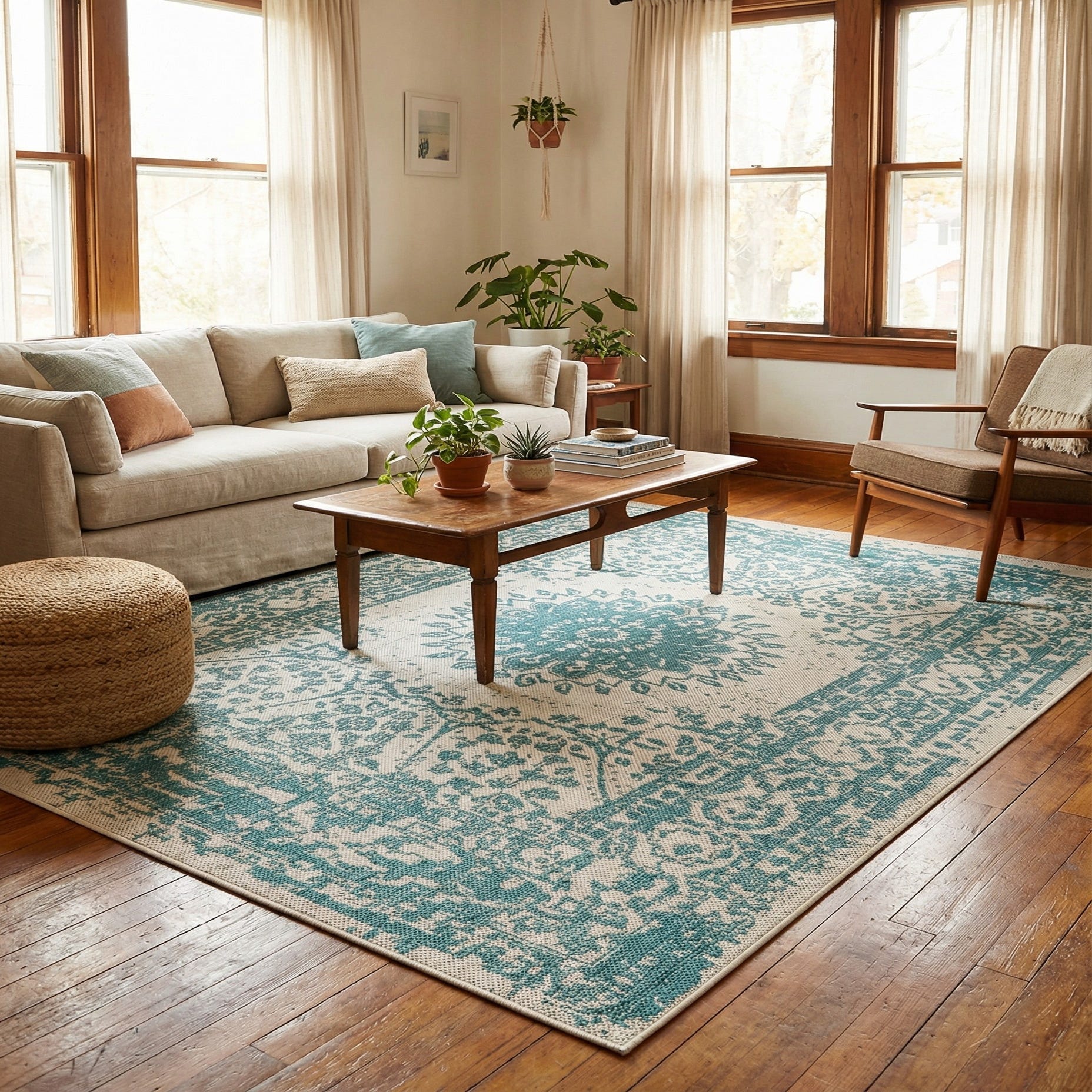 Primary color is Aqua. Colors in this rug include: Aqua, Ivory.