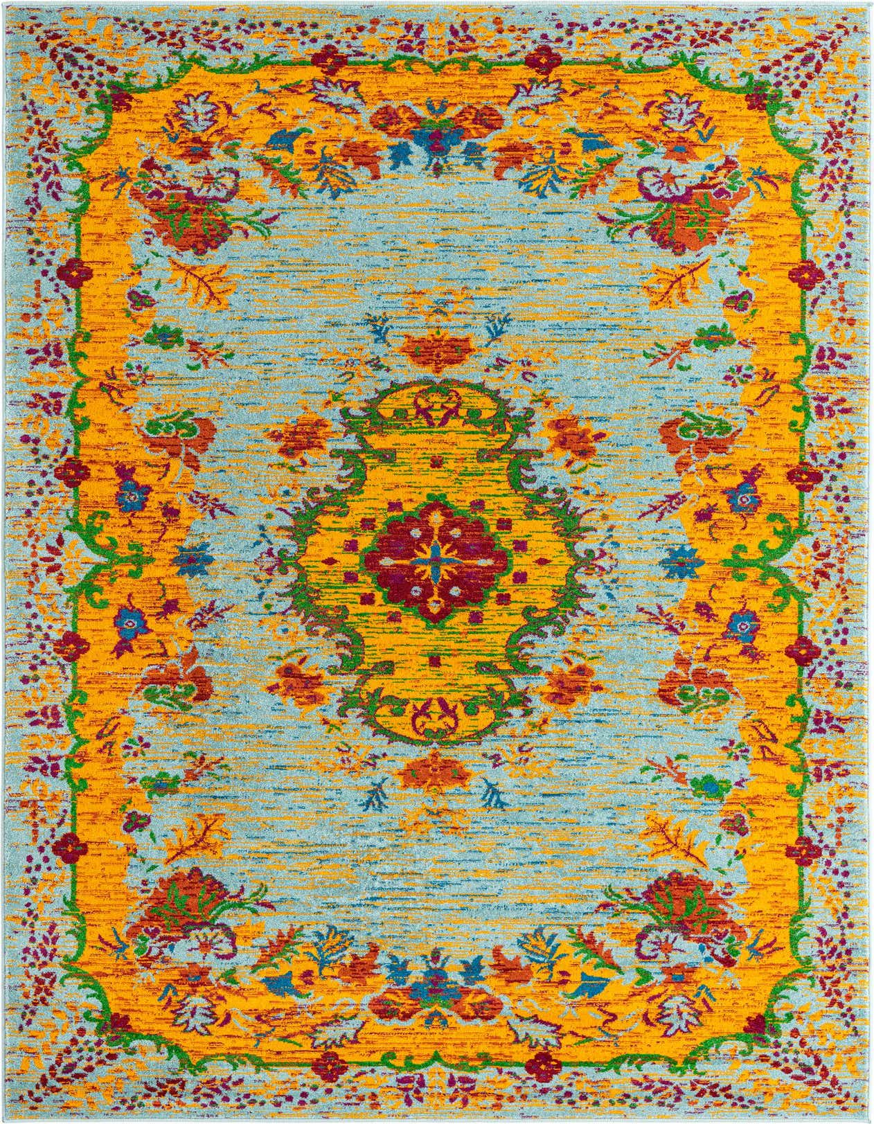 The rug's design boasts a richly colored palette, including aqua, blue, orange, purple, yellow, and red, with an aqua background that anchors the pattern. The floral and botanical motifs create an engaging and energetic atmosphere, perfect for enlivening any room.
