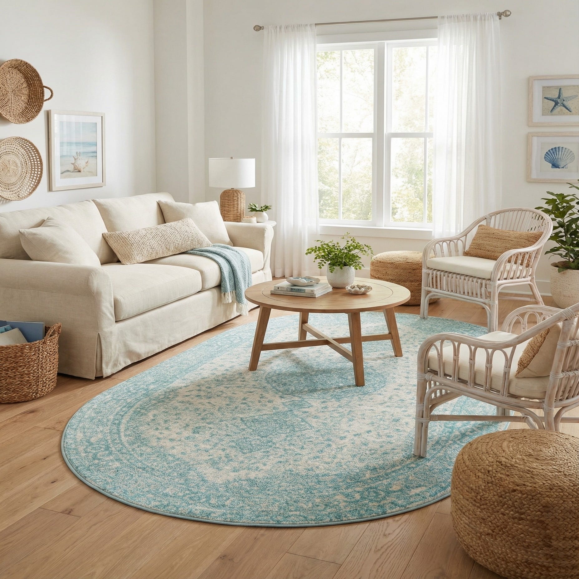 A light blue and cream oval rug with a distressed traditional pattern, featuring a central medallion and ornate border.