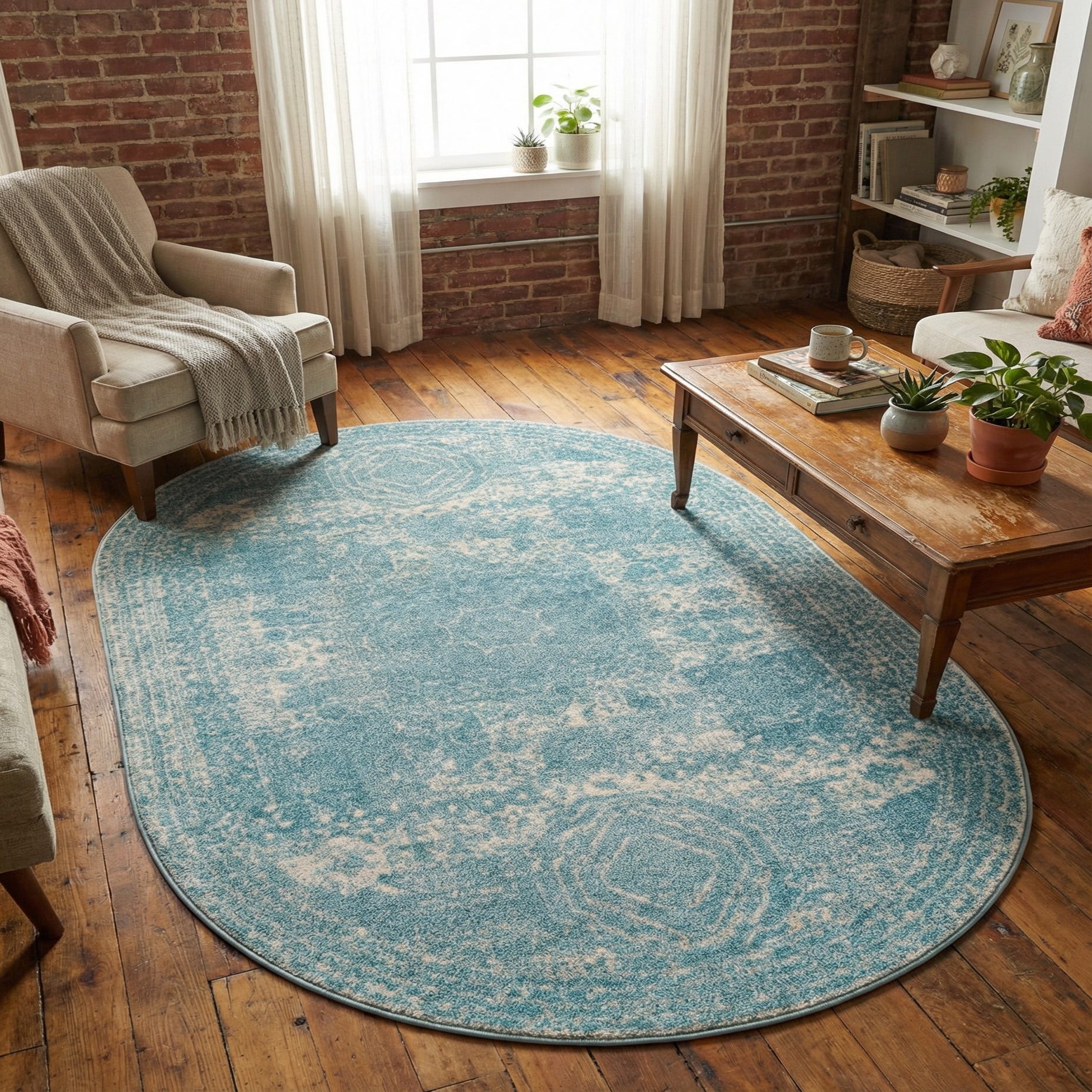The Dover collection presents a stylish 5x8 oval rug, machine-woven of 100% polypropylene, ensuring durability and ease of maintenance. The rug showcases an engaging aqua background imbued with ivory accents, establishing a refreshing and serene atmosphere. With a deliberate weathered and distressed pattern, it echoes the charm of vintage heirlooms while maintaining a modern edge suitable for contemporary living.