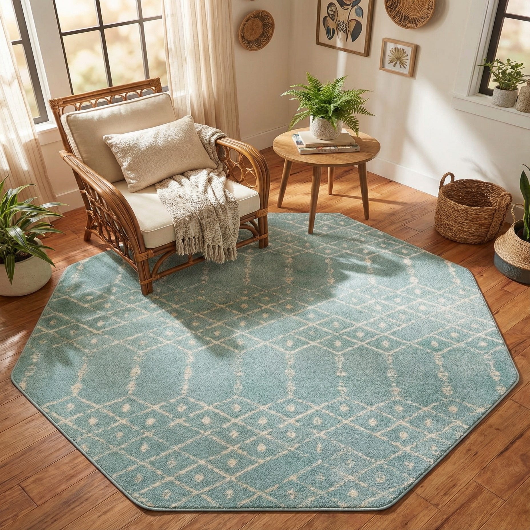 A cool aqua field sets the tone for this octagonal rug, with an ivory trellis pattern laid across the surface in a soft, slightly distressed finish. The repeating lattice and small diamond motifs create a subtle geometric rhythm that reads fresh without dominating the room. The low, dense pile of 100% polypropylene is smooth to the touch and offers a gentle cushioning underfoot, while the cleanly bound edges keep the shape feeling crisp.
