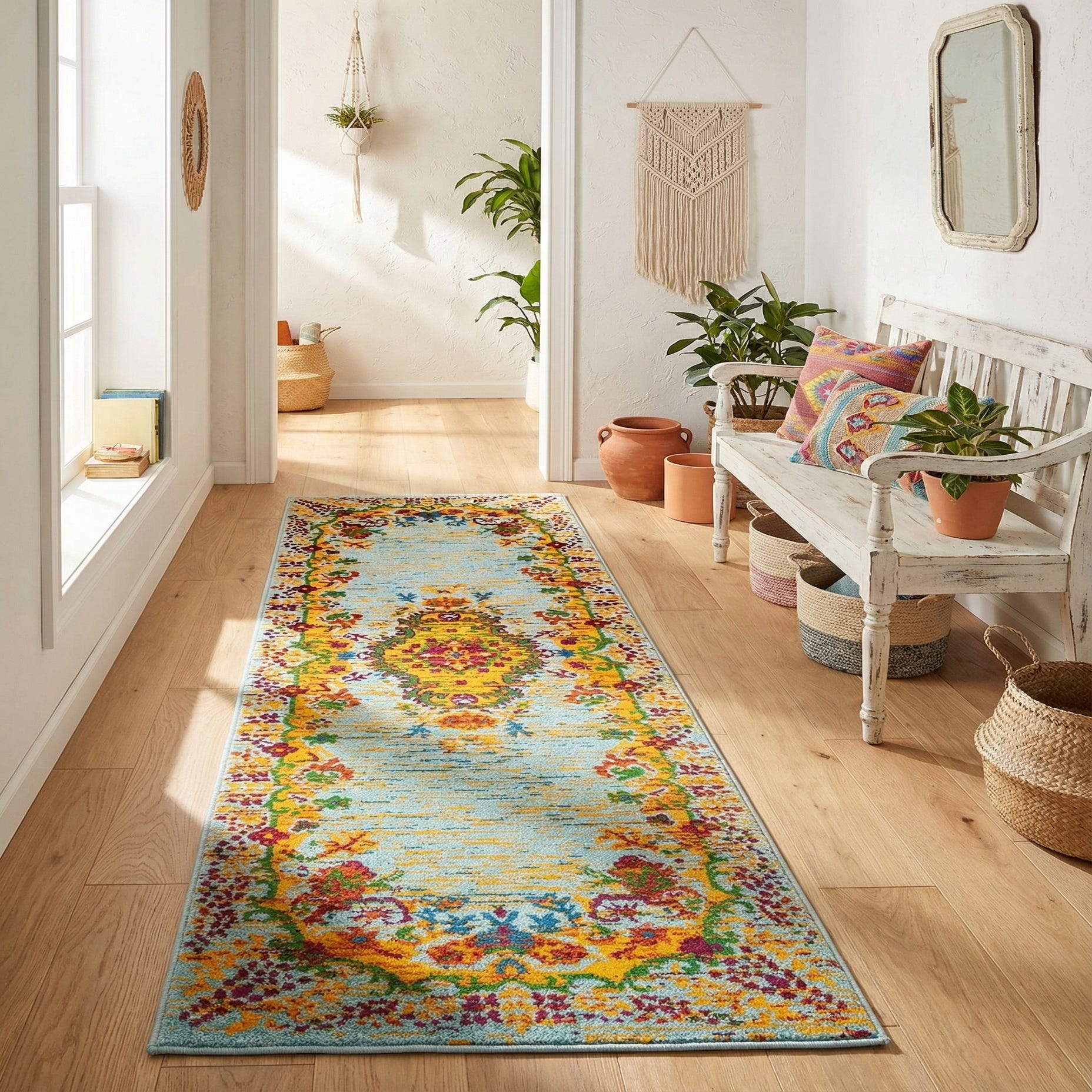 A 6 ft runner rug with a light blue background, featuring a vibrant gold, red, and green traditional botanical medallion pattern.