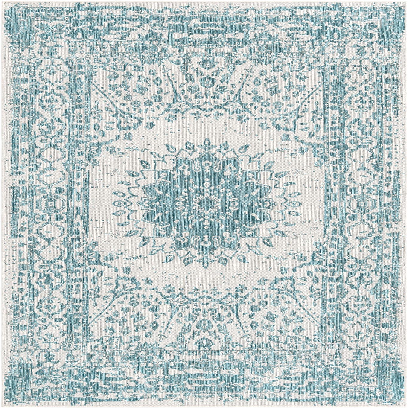 A 6x9 rectangular indoor/outdoor rug featuring a distressed blue medallion and traditional pattern on a light background.