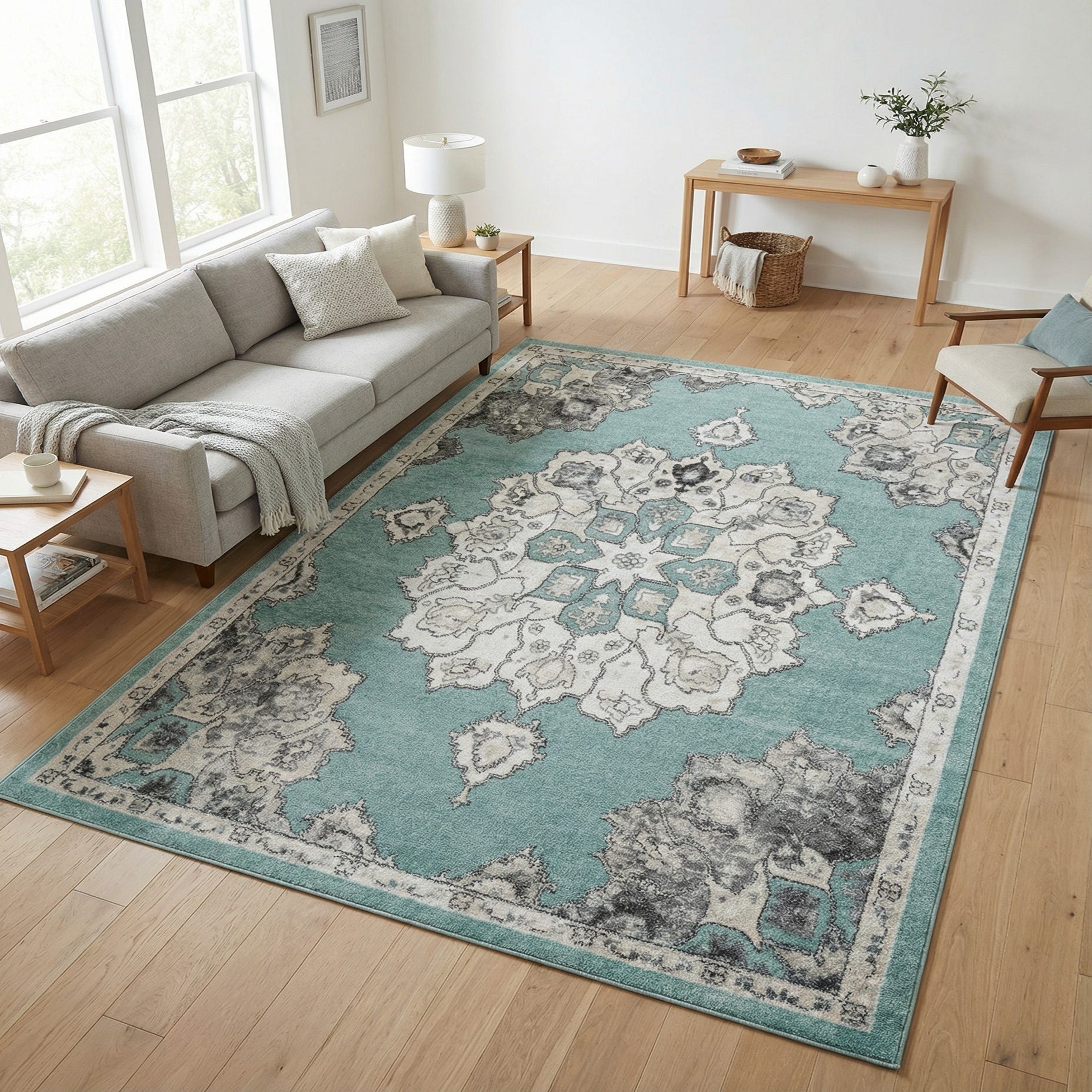 A classic medallion pattern rests on an aqua background, with the central motif and surrounding florals rendered in ivory, beige and soft gray with accents of black. The design has a gently distressed look that gives the pattern an aged, collected feel without heavy contrast. Machine-made of 100% polypropylene, the rug has a low, dense pile with a smooth, slightly lustrous surface that feels soft underfoot while holding the pattern definition clearly.