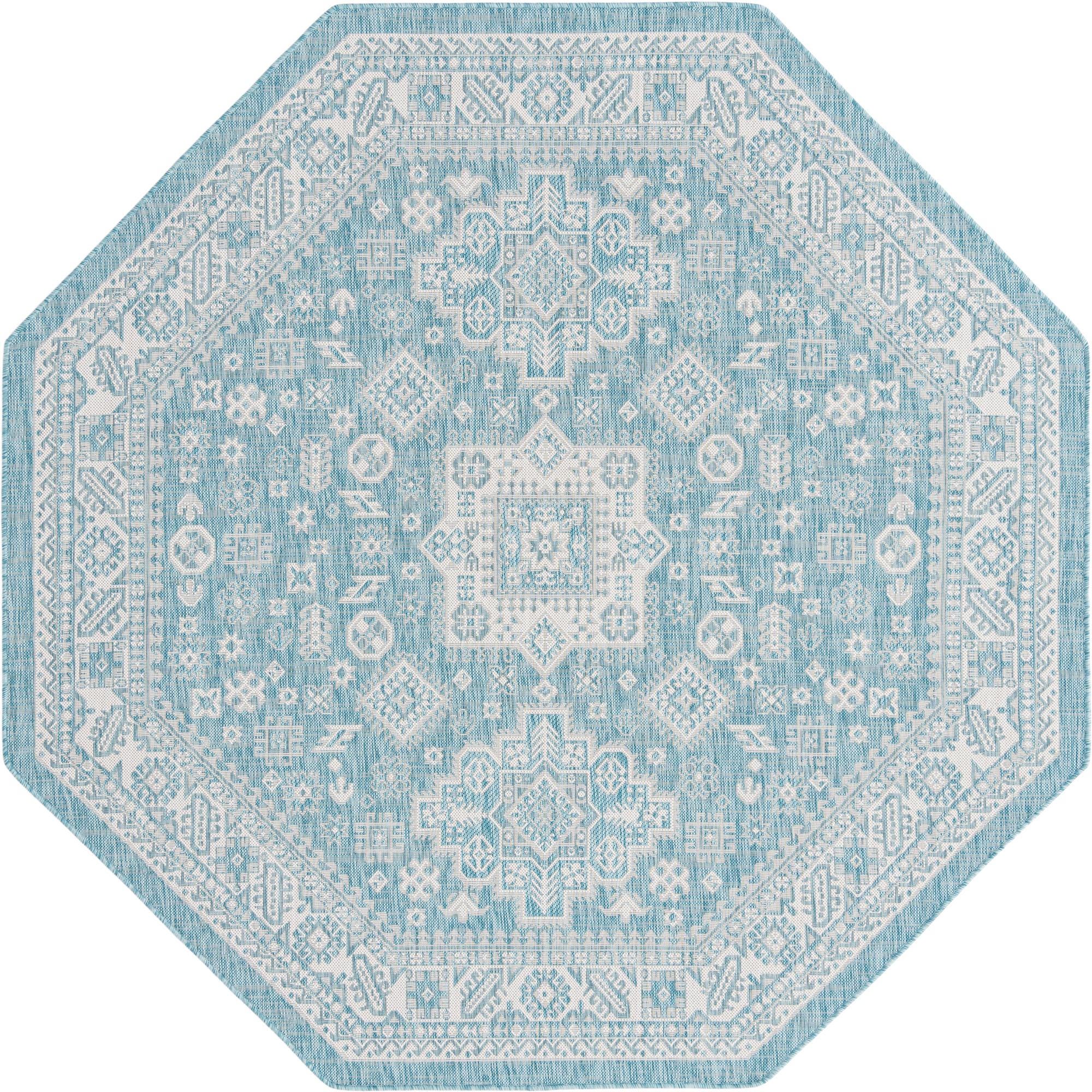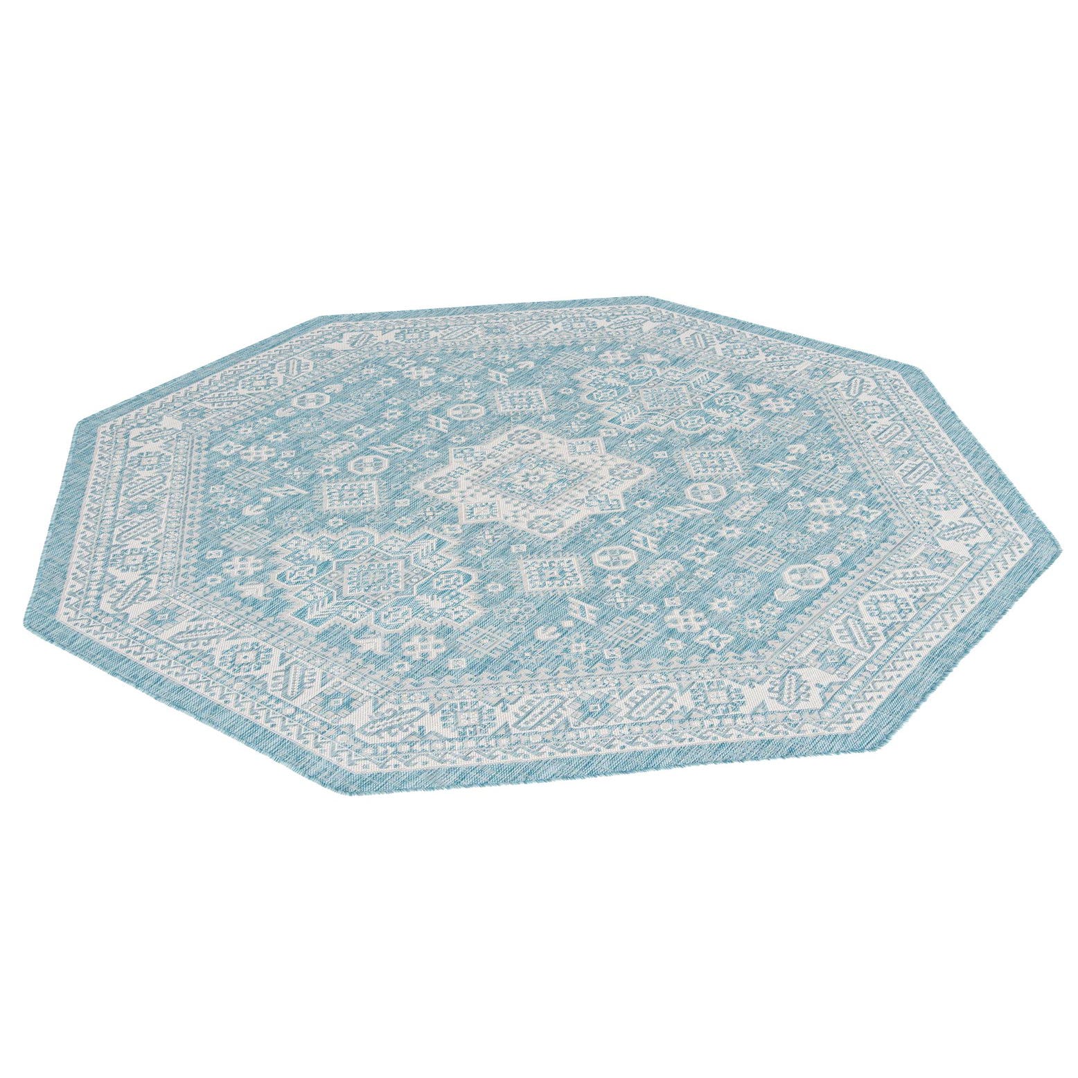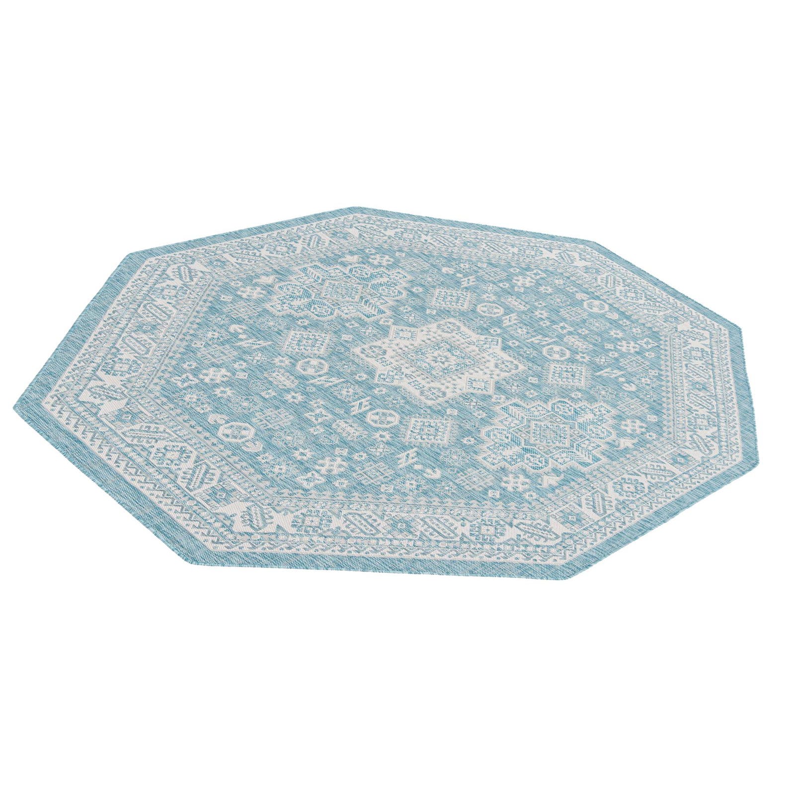A notable fit for outdoor living spaces due to its robust material, this rug can also enhance interiors such as sunrooms, conservatories, or modern living rooms that benefit from its calming color scheme and distinctive geometric motifs. The rug's unique octagonal shape and eye-catching design would serve as a focal point in minimalistic settings or complement bohemian and coastal-inspired decors.