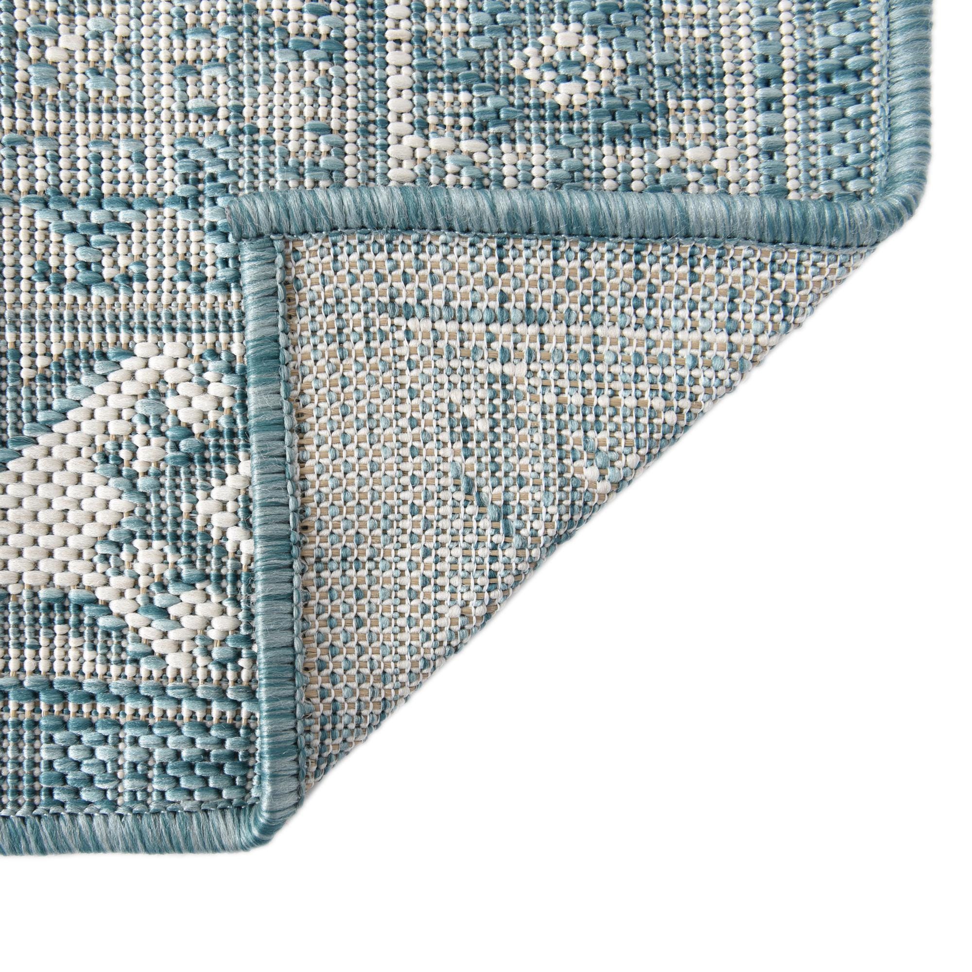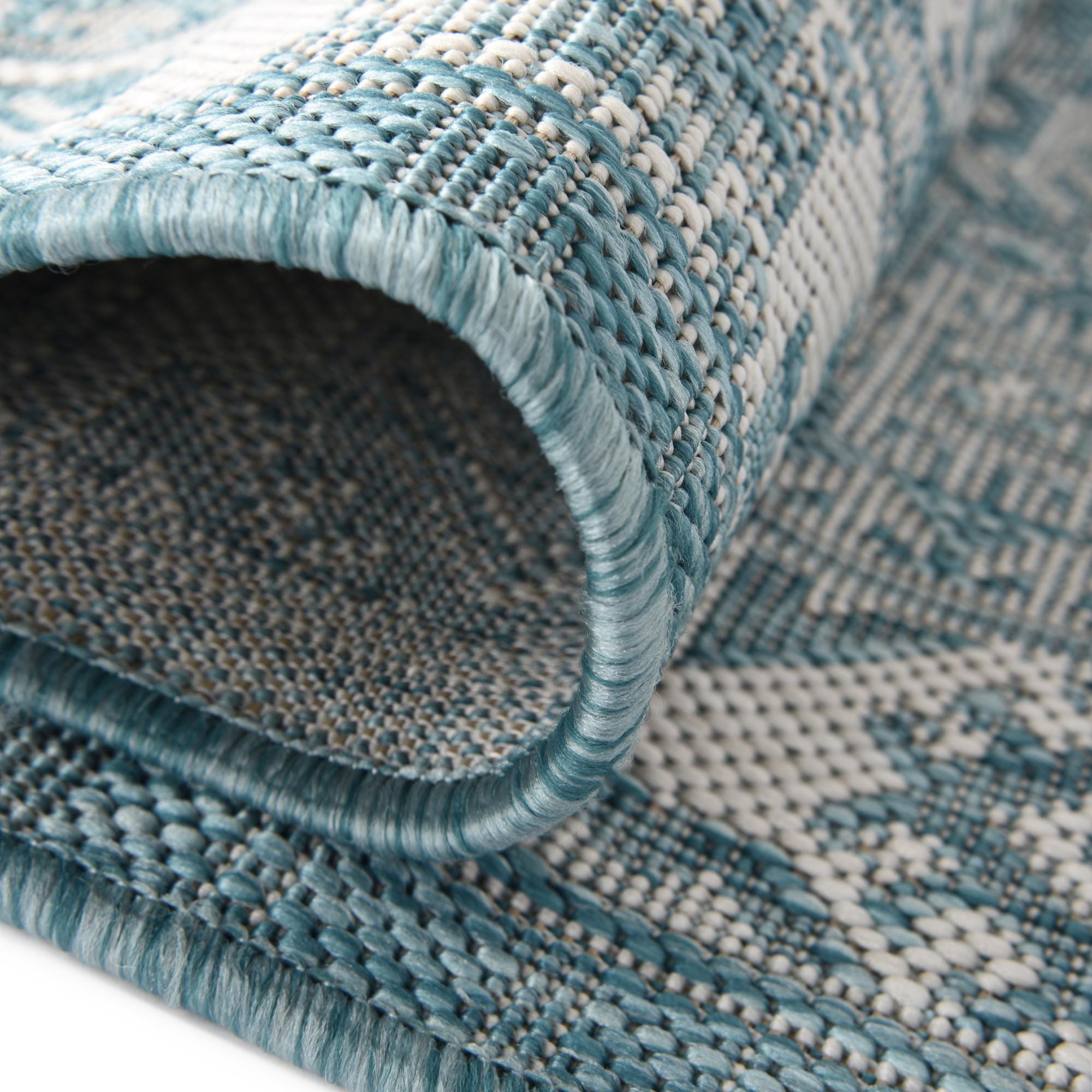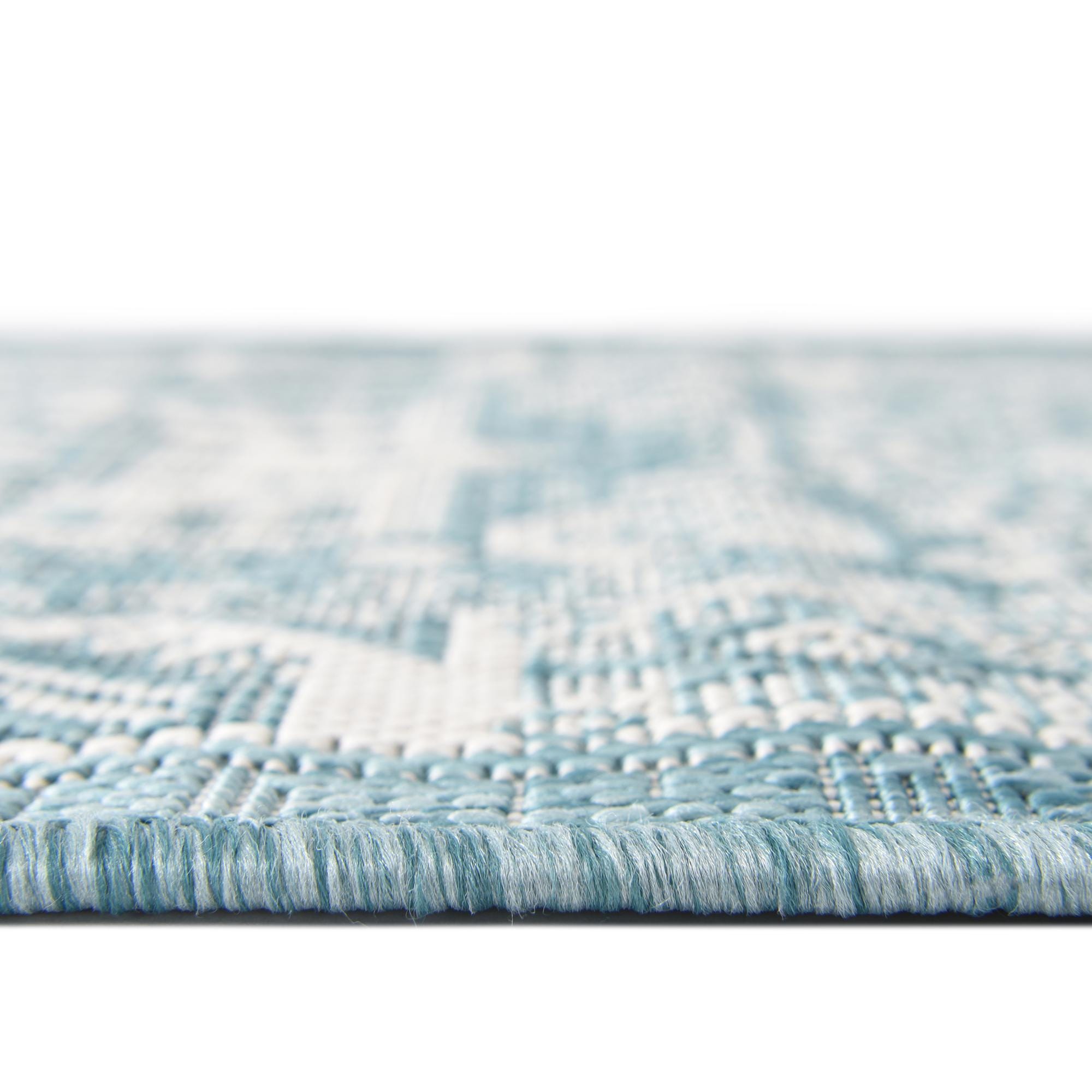 The Outdoor Aztec Collection presents a machine-woven 8 Ft Octagon rug crafted from 100% polypropylene, offering both durability and effortless maintenance. The rug showcases an intricate Aztec-inspired pattern enveloped in a harmonious palette of aqua, blue, and ivory which provides a serene and inviting atmosphere. Its flatweave construction yields a smooth texture that can seamlessly transition from casual to sophisticated settings.