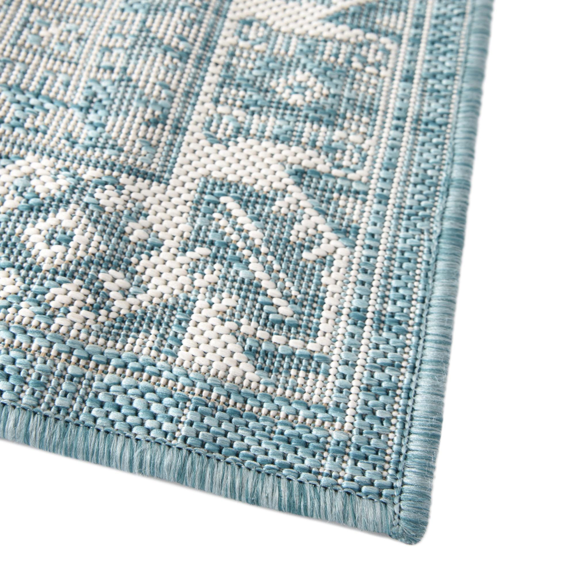 Primary color is Aqua. Colors in this rug include: Aqua, Blue, Ivory.