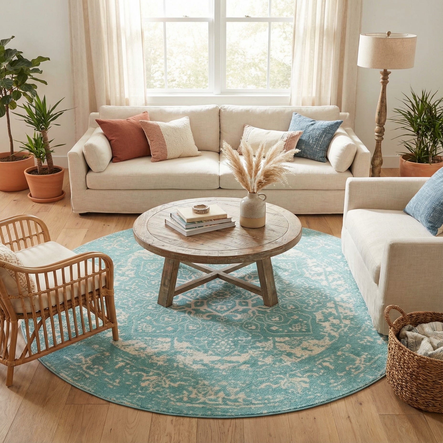The round shape and airy color make this rug a great anchor for a relaxed seating area, a light-filled bedroom, or a sunroom. Pair it with natural wood tones, linen upholstery and woven accents for a coastal or cottage-inspired vibe, or use it in a transitional space with pale neutrals and simple lines to introduce pattern without overwhelming the room. It also works well centered beneath a round table or beneath a reading chair to define and brighten the area.