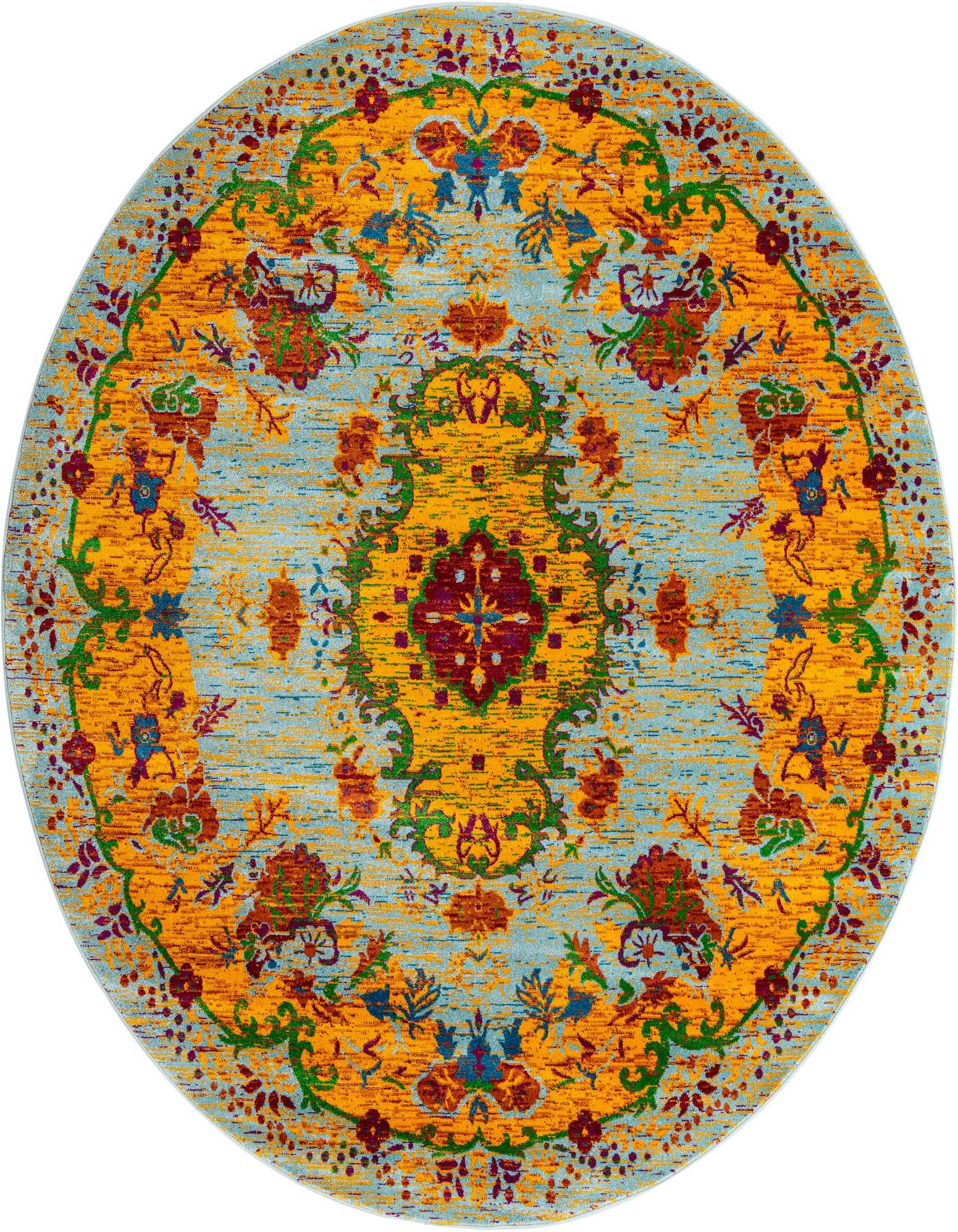 Primary color is Aqua. Colors in this rug include: Aqua, Blue, Orange, Purple, Yellow, Red.