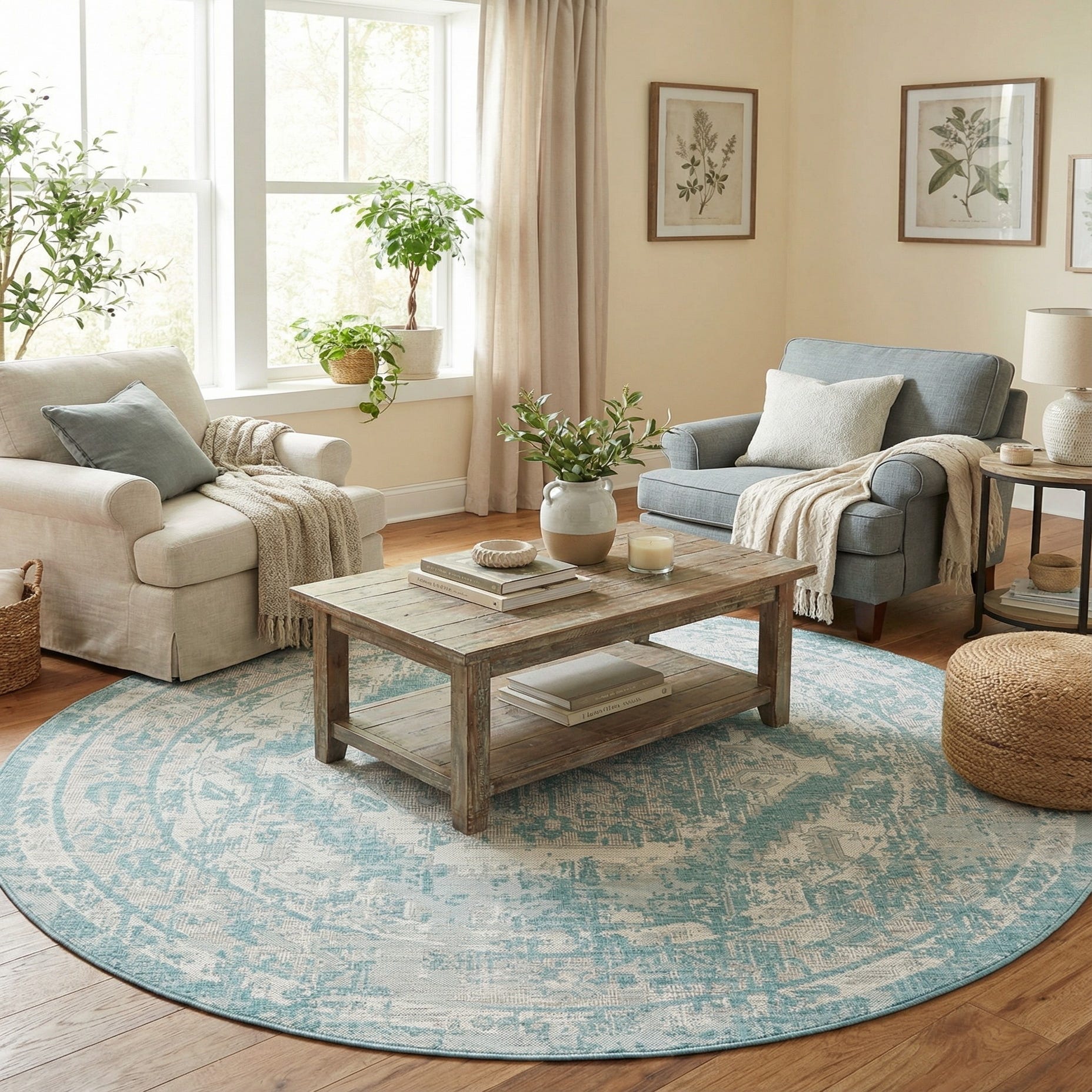 This rug could serve as the focal point in a minimalist or coastal-inspired decor, or it could complement a more traditional setup by adding a touch of outdoor elegance. The round shape is particularly well-suited for arranging furniture in a circular configuration, encouraging intimate gatherings and conversations in your outdoor living space.