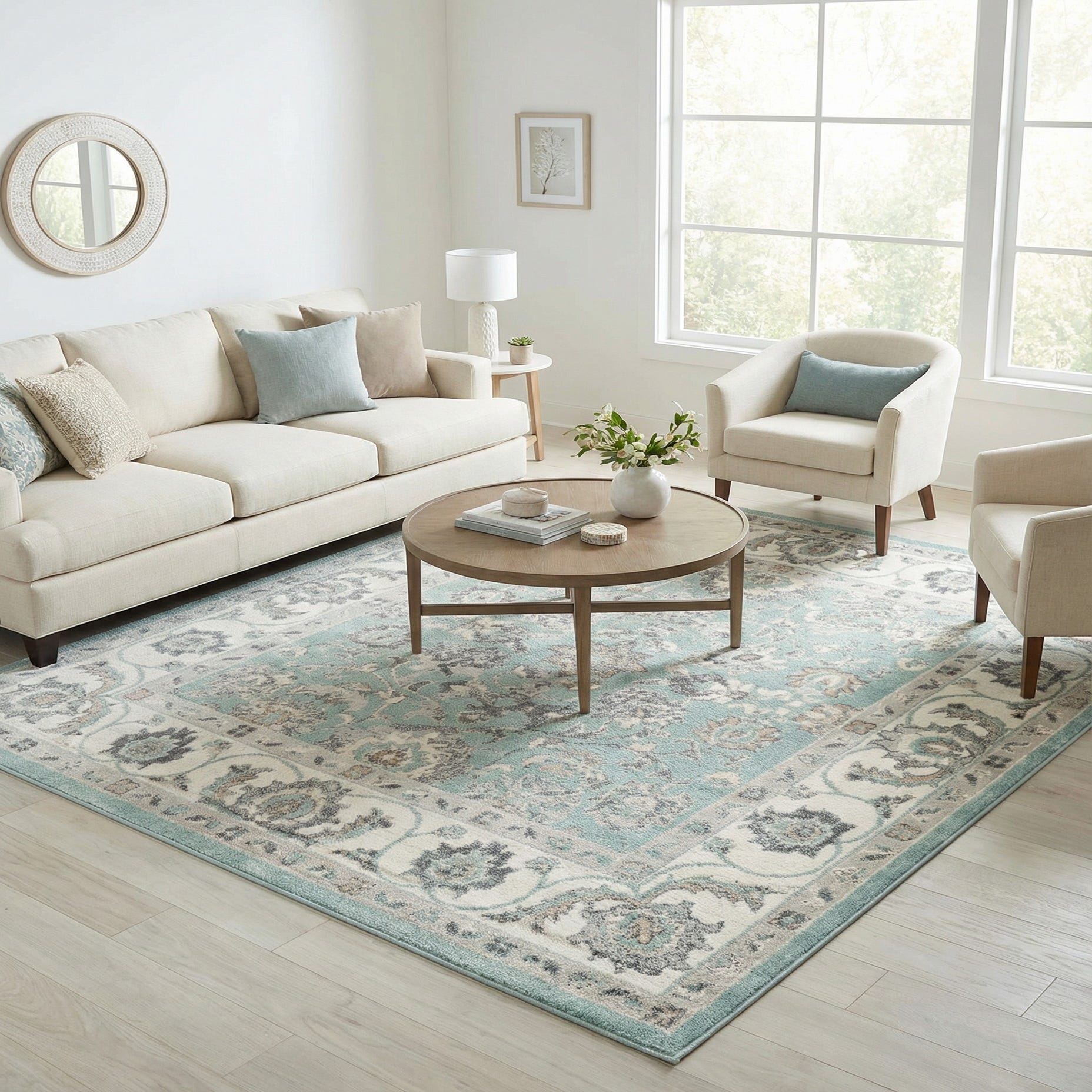 The cool aqua base and neutral accents work well in coastal, cottage and transitional interiors. Place it beneath a linen sofa to soften a living room, layer it under a round dining table to introduce a calming color story, or let it anchor a bedroom seating area for a serene, collected feel. The palette pairs nicely with weathered woods, light upholstery and soft metallic finishes.