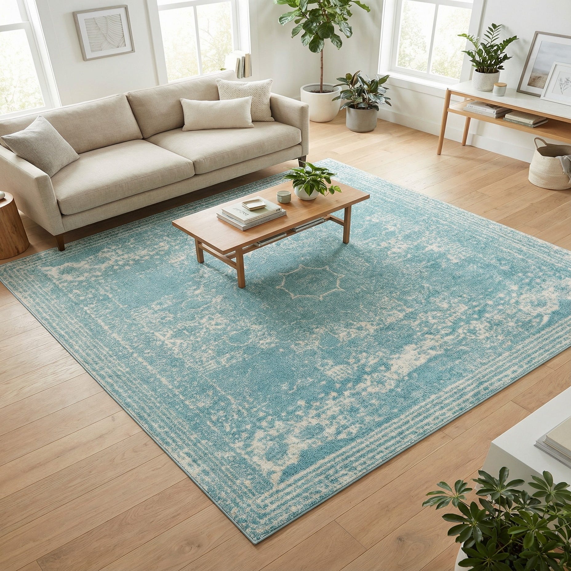 Primary color is Aqua. Colors in this rug include: Aqua, Ivory.