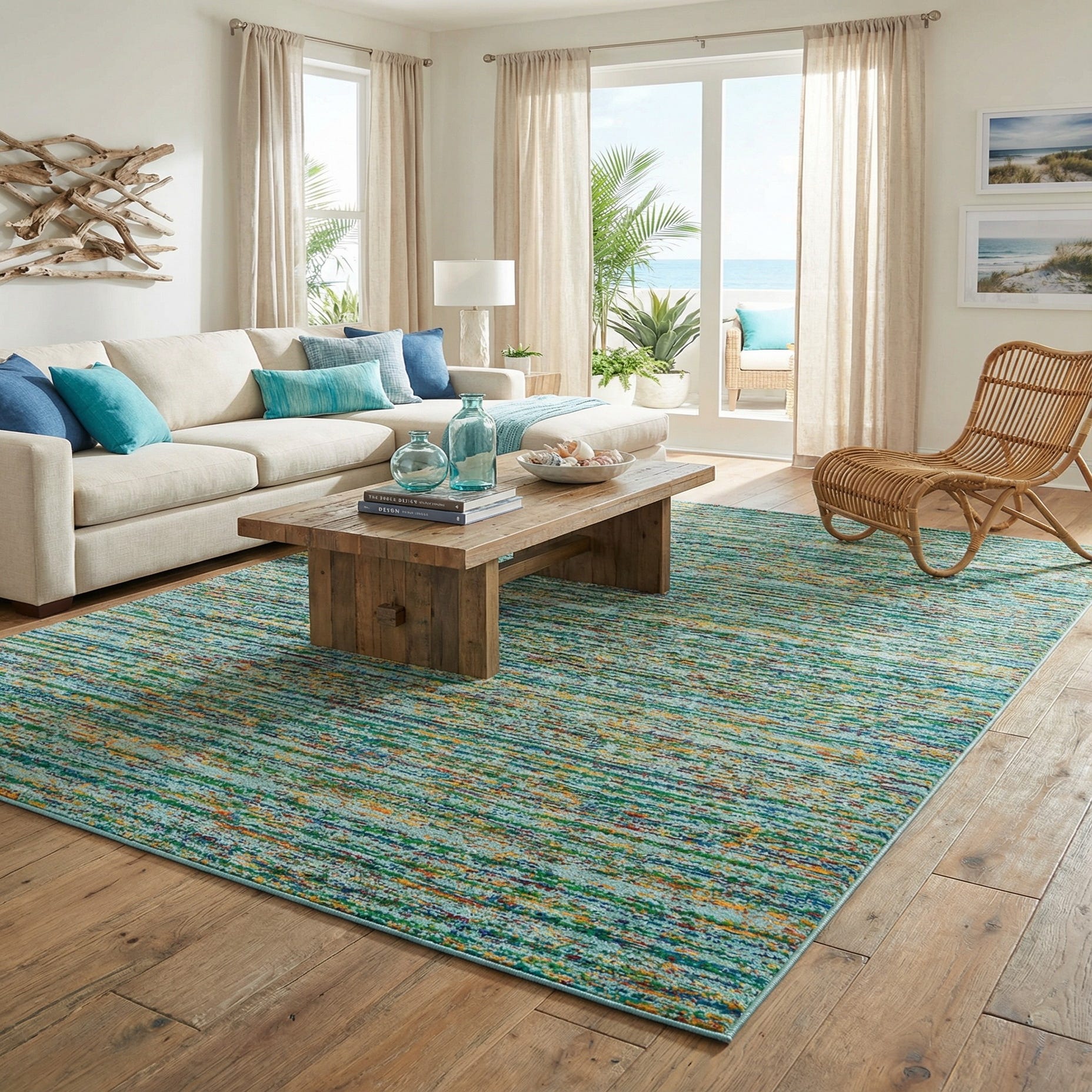This rug works well as an anchor for a casual living room or family room, where the aqua base brings a fresh, coastal energy to neutral seating and wood tones. It also fits nicely under a dining table or in a sunroom, and pairs easily with mid-century modern furnishings or natural materials like rattan and light-stained wood for a relaxed, modern vibe. For a more layered look, combine it with navy accents or warm yellow pillows to echo the rug’s color pops.