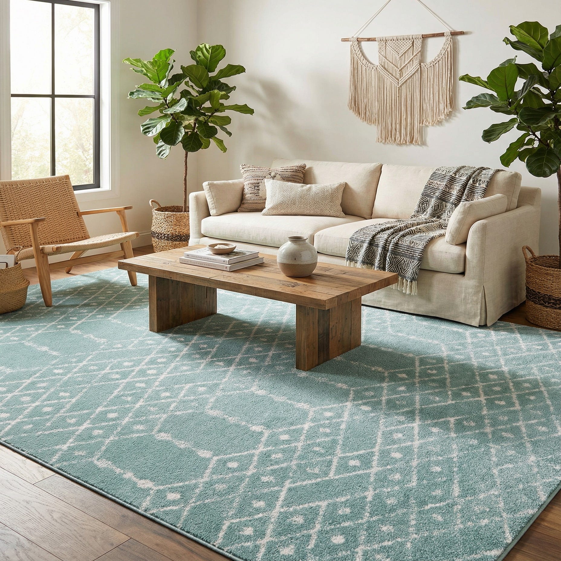 A soft aqua field sets a calm foundation for a crisp ivory trellis pattern that repeats across the surface in diamond lattices, dotted accents and elongated medallion bands. The geometric motif reads both modern and slightly traditional, offering structure without appearing heavy. Machine made from 100% polypropylene, the rug has a low, dense pile with a smooth, slightly cushioned hand and a subtle fiber sheen that catches light for gentle depth and dimension.
