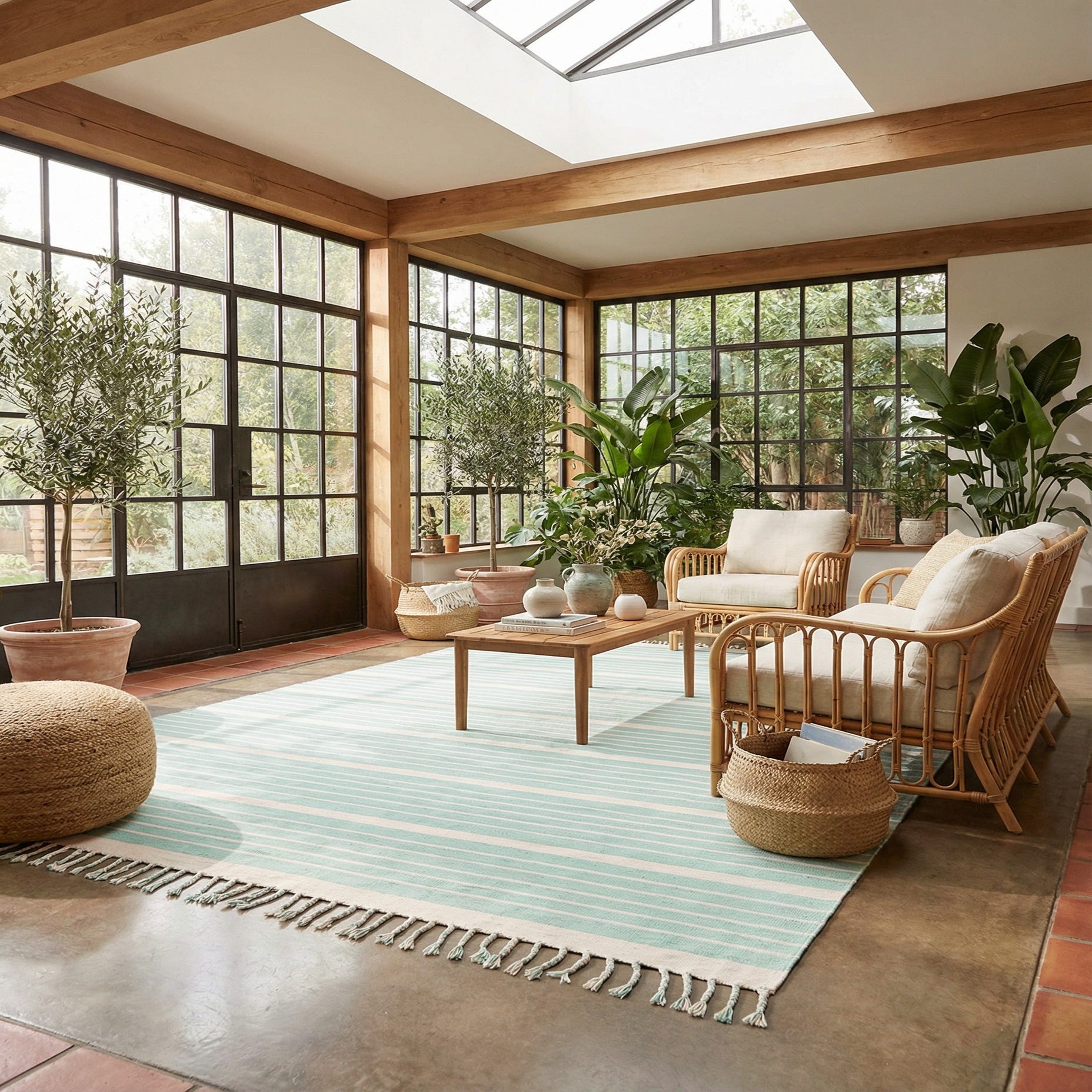 This rug works well in bright, open spaces — think a large living room beneath a seating group, a sunny dining area or a breezy sunroom. Its coastal-inspired palette and straightforward stripe pattern also pair nicely with Scandinavian, modern farmhouse, or casual bohemian decor; layer it over a natural-fiber rug for depth or let it sit alone to keep a room feeling light and airy.