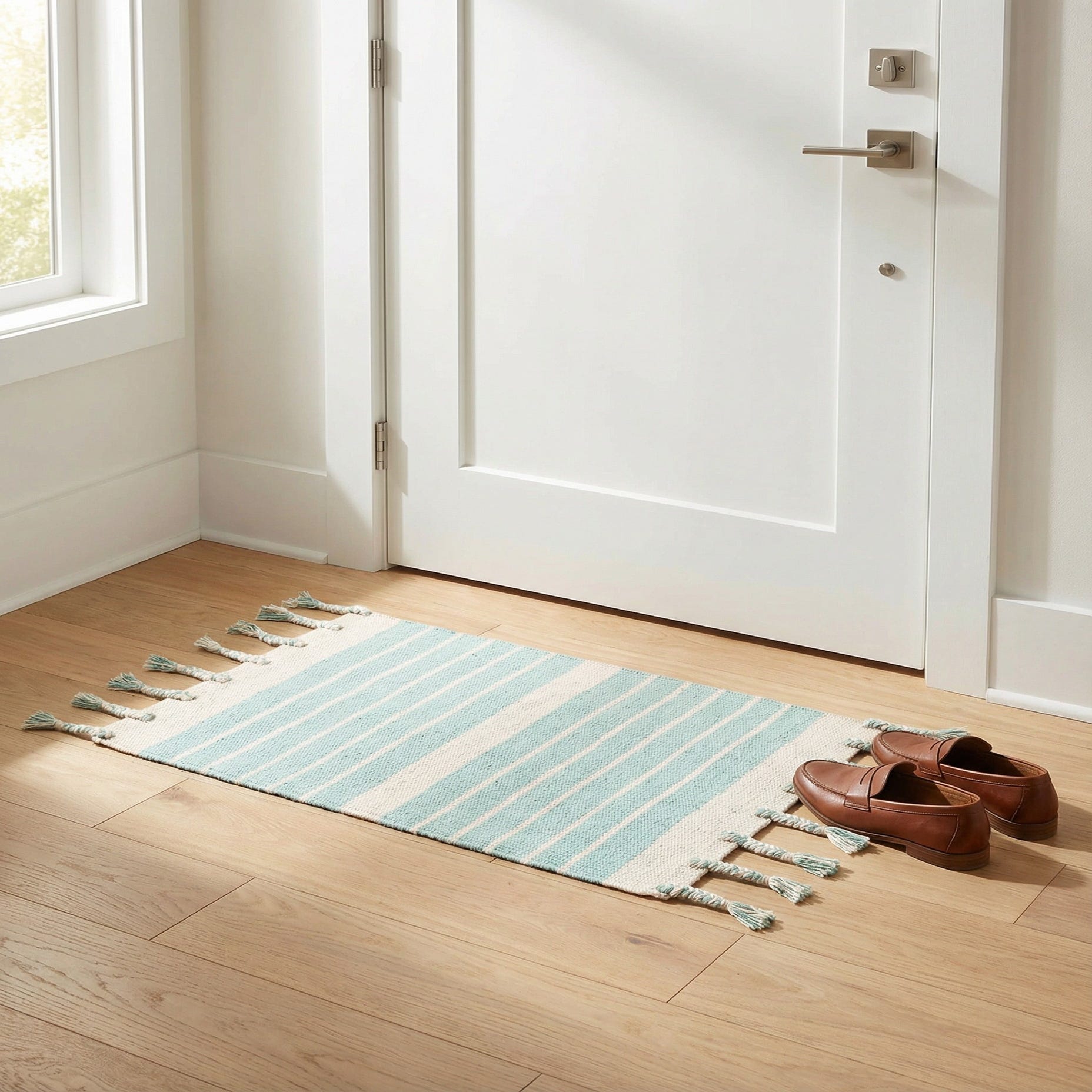 This rug fits well in casual, coastal, or cottage-inspired interiors where light, airy color is desired. Place it at an entry, in front of a sink, beside a bed, or layered under a small coffee table to introduce color and pattern without overwhelming the room. Its relaxed texture and simple palette make it a natural choice for seaside, Scandinavian, or modern farmhouse schemes.