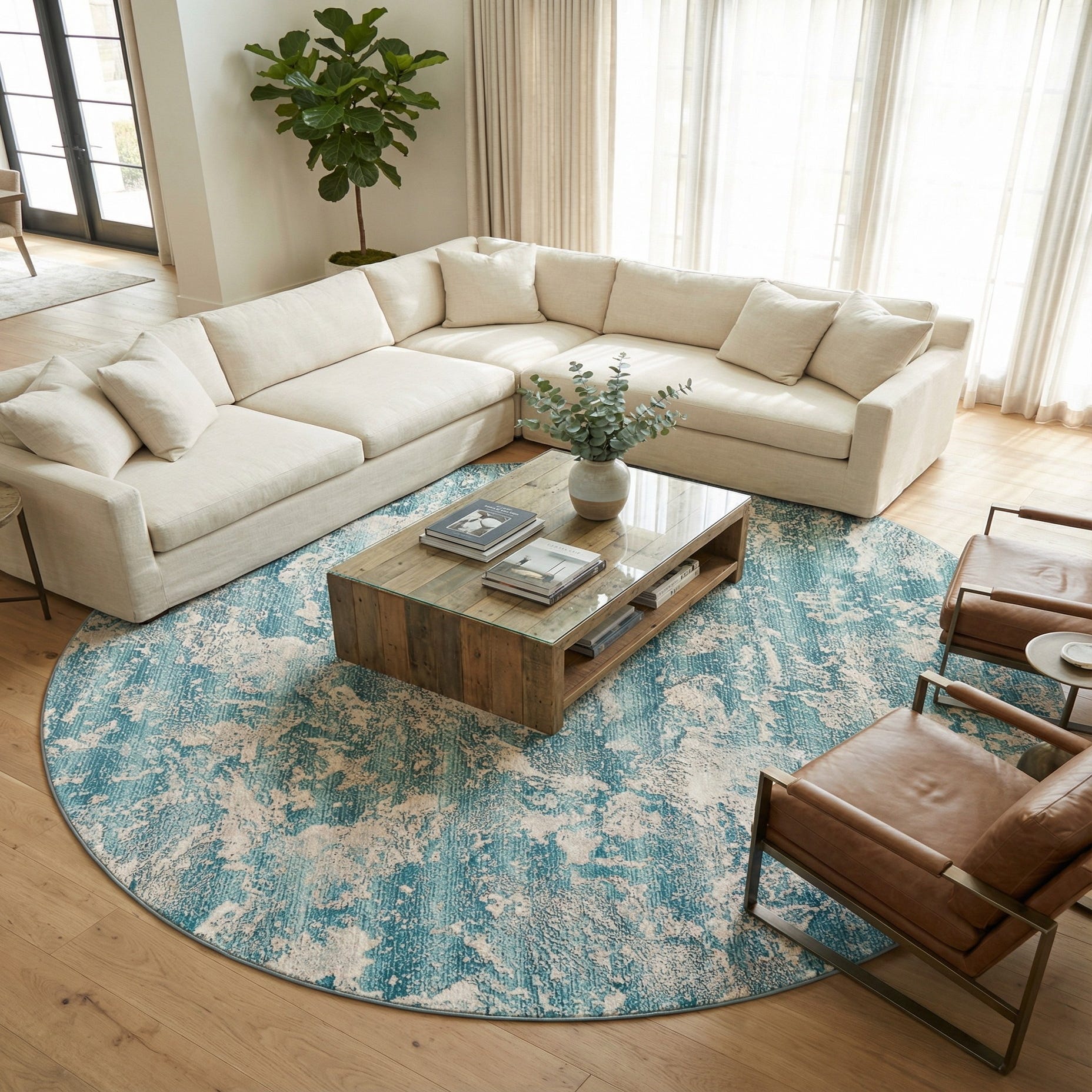 A 10-foot round blue and white abstract rug with a textured, flatweave pile, suitable for indoor or outdoor use.