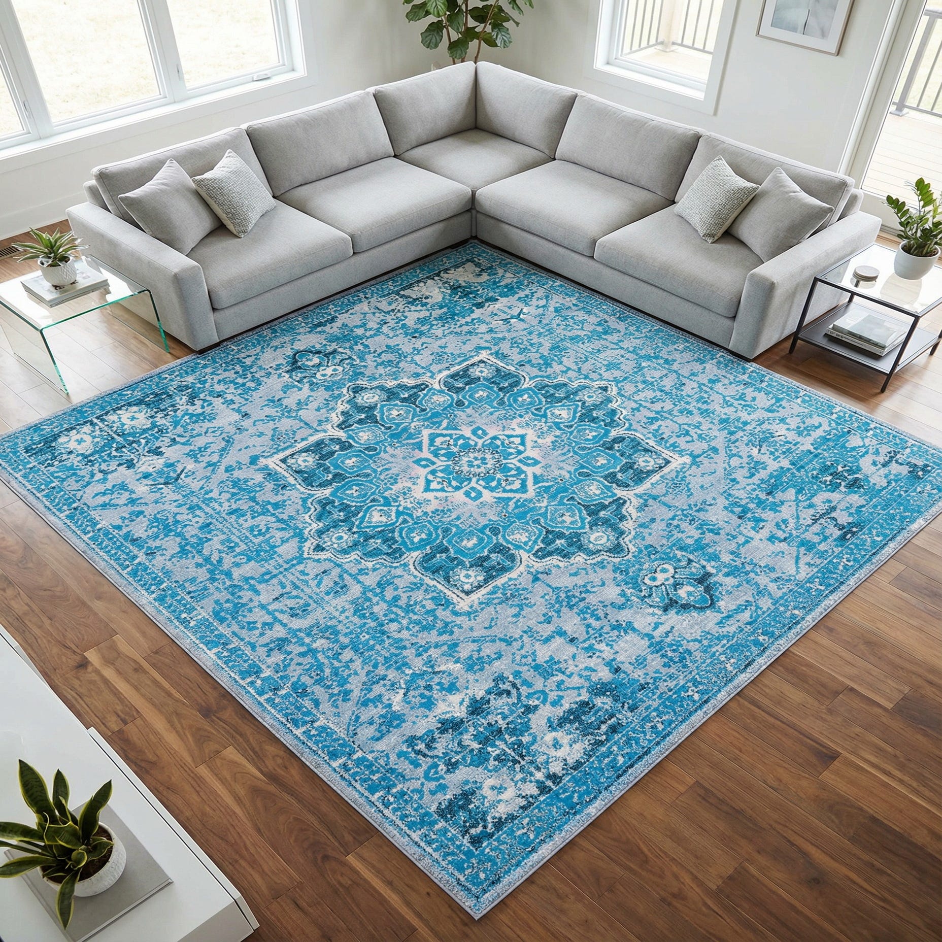 Primary color is Aqua Blue. Colors in this rug include: Aqua Blue, Light Blue, Ivory, Navy Blue.