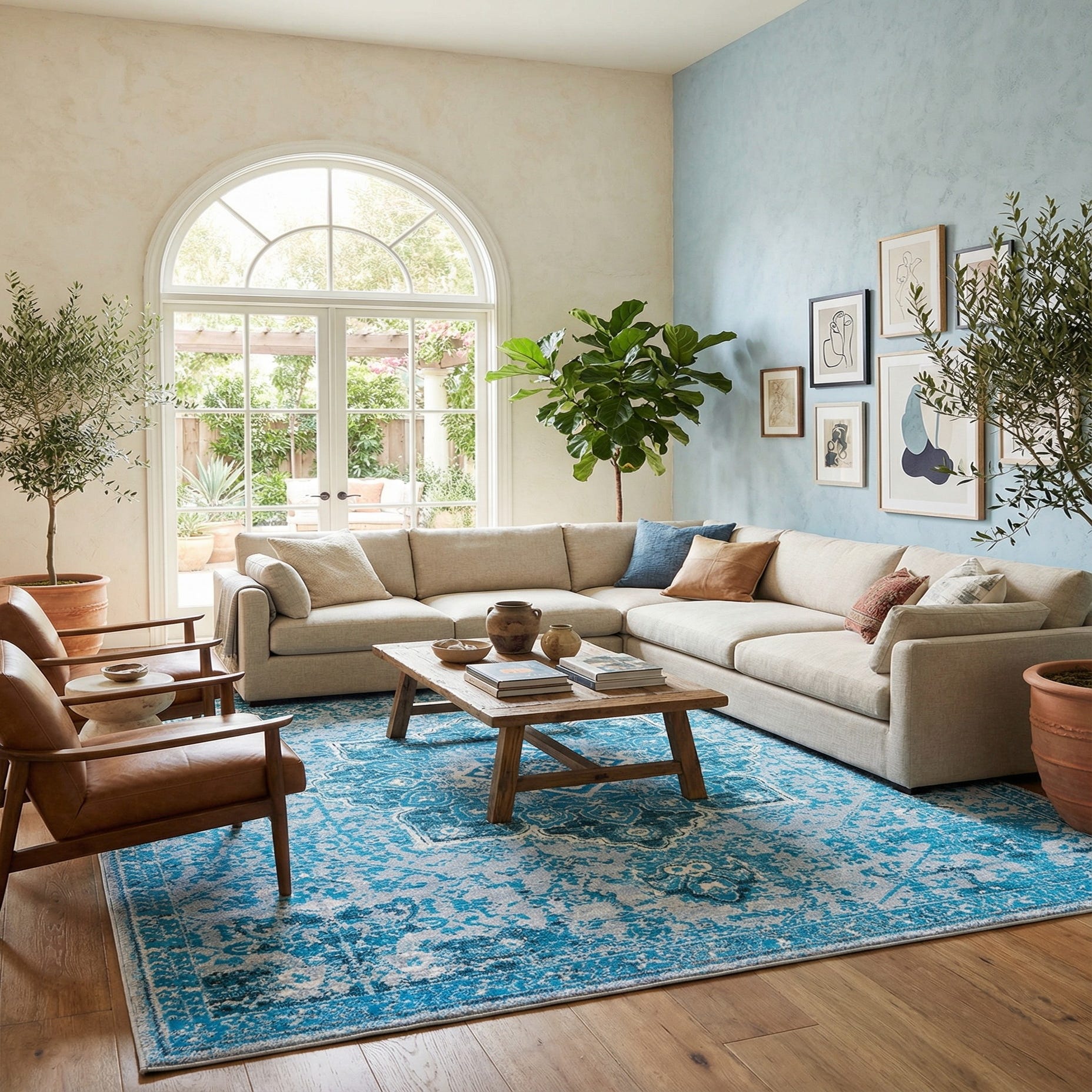This rug fits well in coastal and transitional interiors where color and pattern are welcome—place it beneath a seating group to anchor a living room, under a dining table to introduce color, or layered at the foot of a bed for added texture. It pairs naturally with crisp whites, light woods, navy upholstery, and woven rattan for a relaxed, pulled-together look.