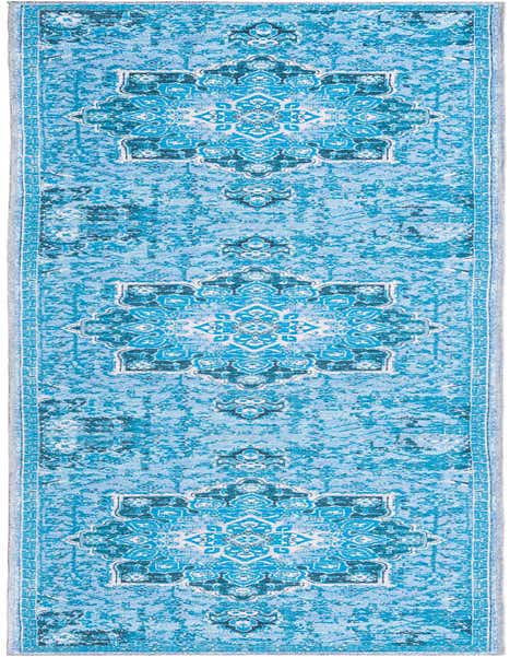 Primary color is Aqua Blue. Colors in this rug include: Aqua Blue, Light Blue, Ivory, Navy Blue.