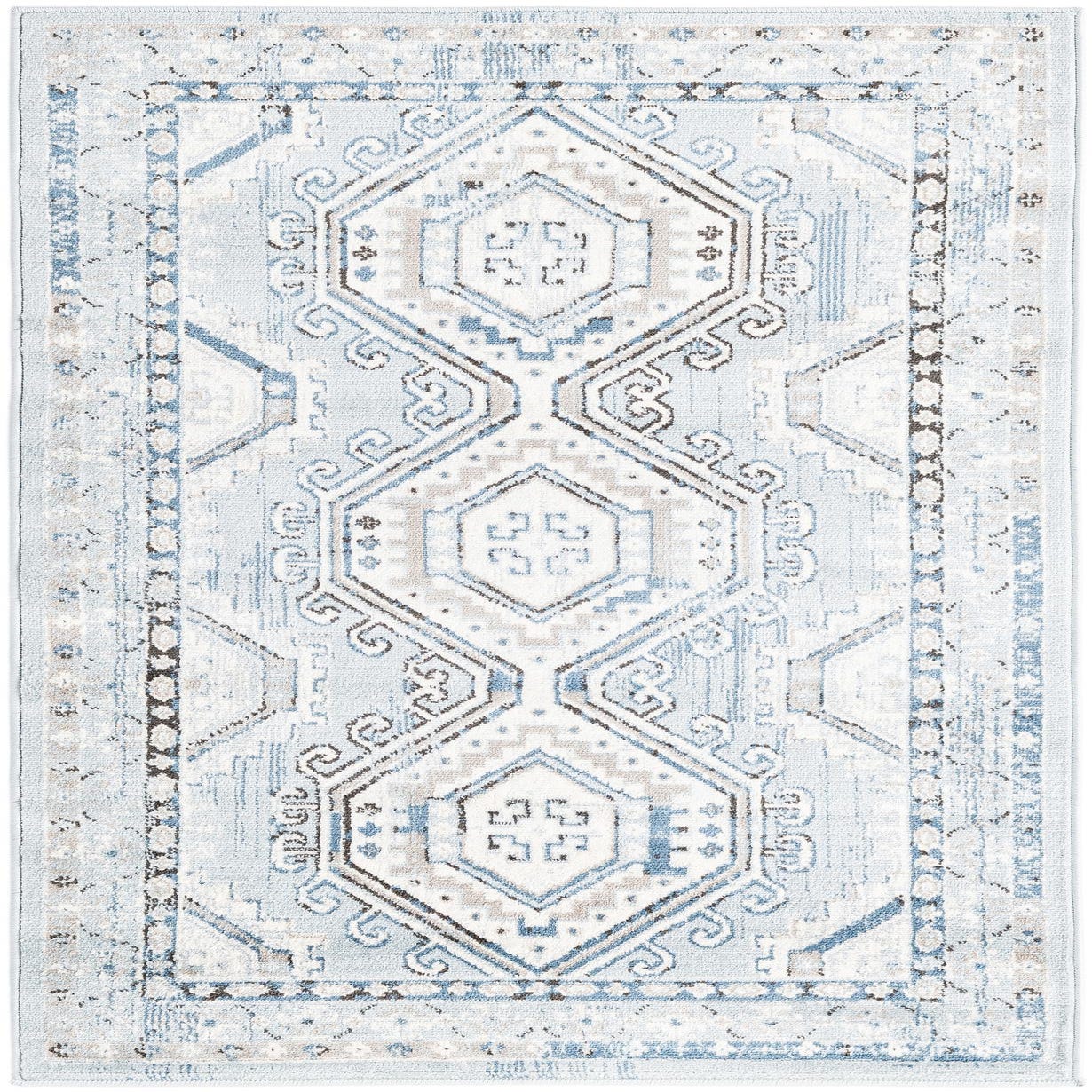 A soft Aqua Blue background sets a calm tone for this low-pile, machine-made rug crafted from 100% polypropylene. Three stacked medallions run down the center, their geometric lines and scrolling corner motifs rendered in ivory, beige and gray with discreet black accents for contrast. A gently distressed border and subtle abrash give the design a lived-in, vintage-inspired look while the flat, tightly woven surface feels smooth underfoot and holds pattern definition without pile height.