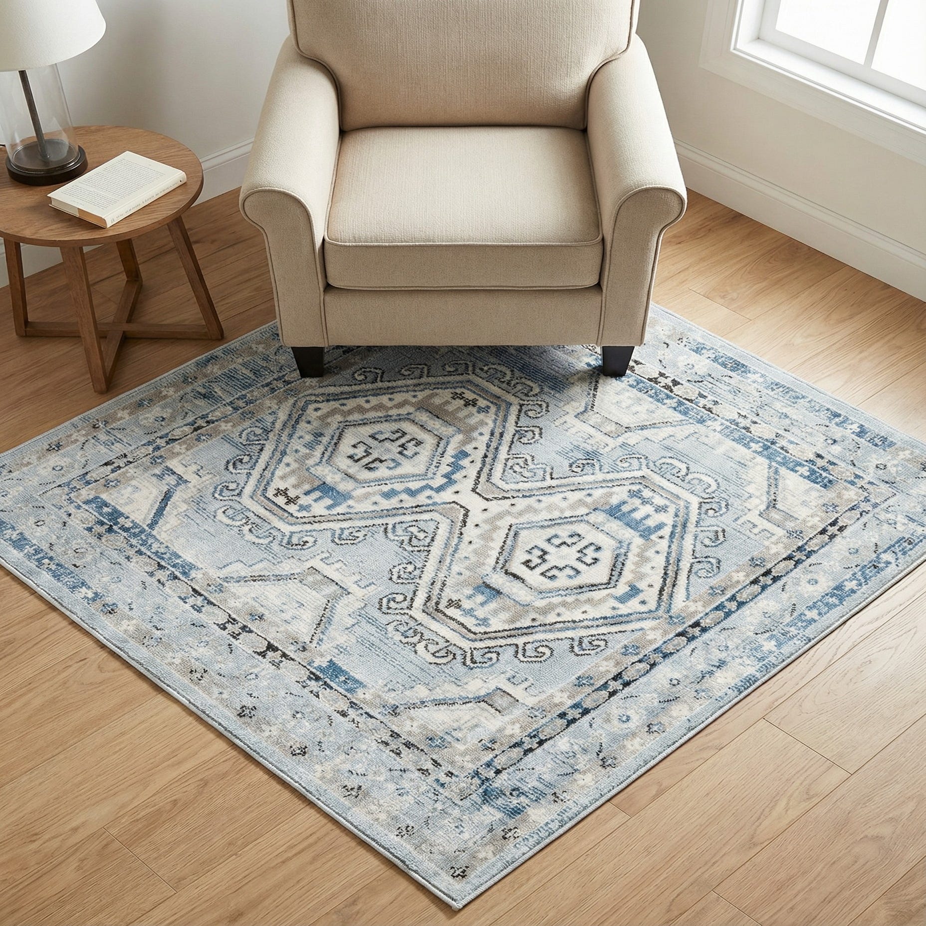 Machine-made from 100% polypropylene, the rug has a low-profile surface with a smooth, slightly lustrous hand. Its balanced color mix and timeless medallion motif fit well with coastal, transitional, or modern farmhouse interiors; try it under a coffee table to soften a living area, layered beneath a small dining set, or placed in a bedroom to add calm, tonal interest.