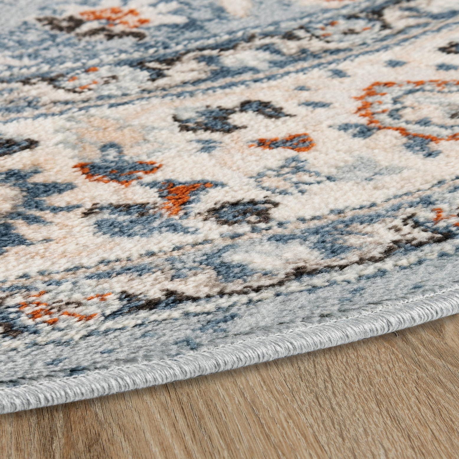 A 5' 3 round blue traditional rug with an ornate floral and oriental pattern in cream, orange, and darker blue.