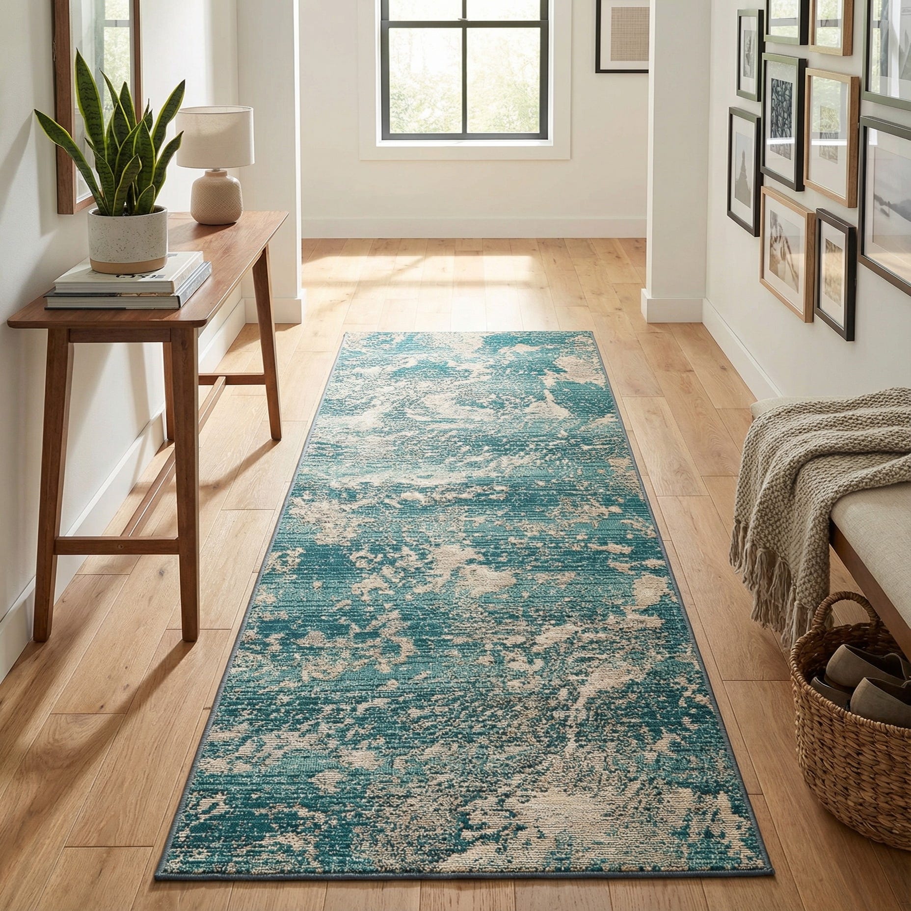 A 5 ft runner rug with an abstract modern pattern in varying shades of blue and beige, suitable for hallways or patios.